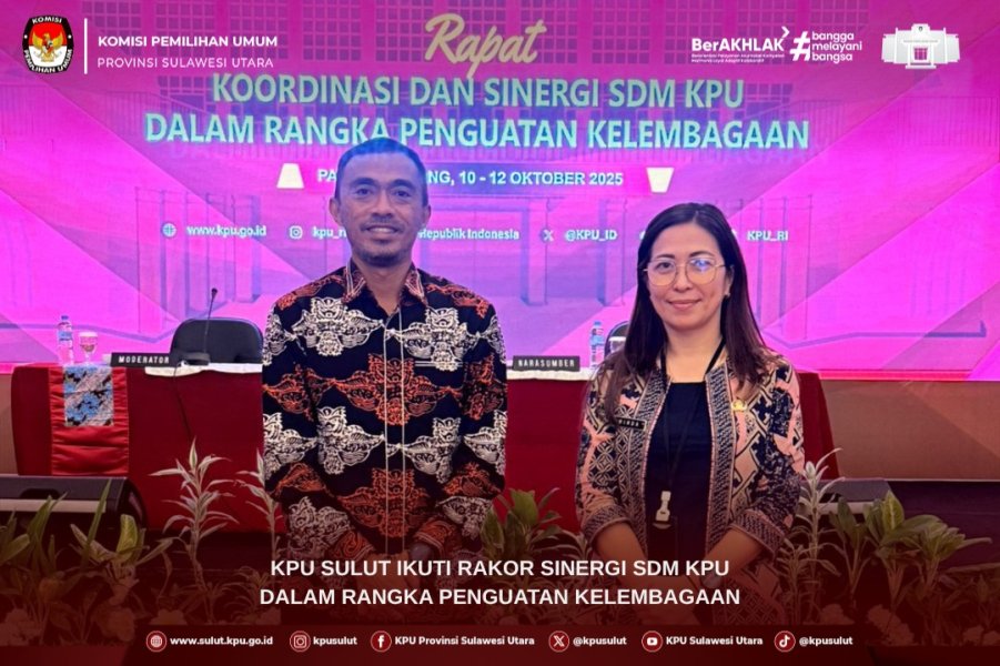 Pangkal Pinang, sulut.kpu.go.id— KPU Sulut ikuti Rapat Koordinasi dan Sinergi SDM KPU dalam Rangka Penguatan Kelembagaan yang diselenggarakan oleh KPU RI di Pangkal Pinang, Kepulauan Bangka Belitung, Jumat (10/10).