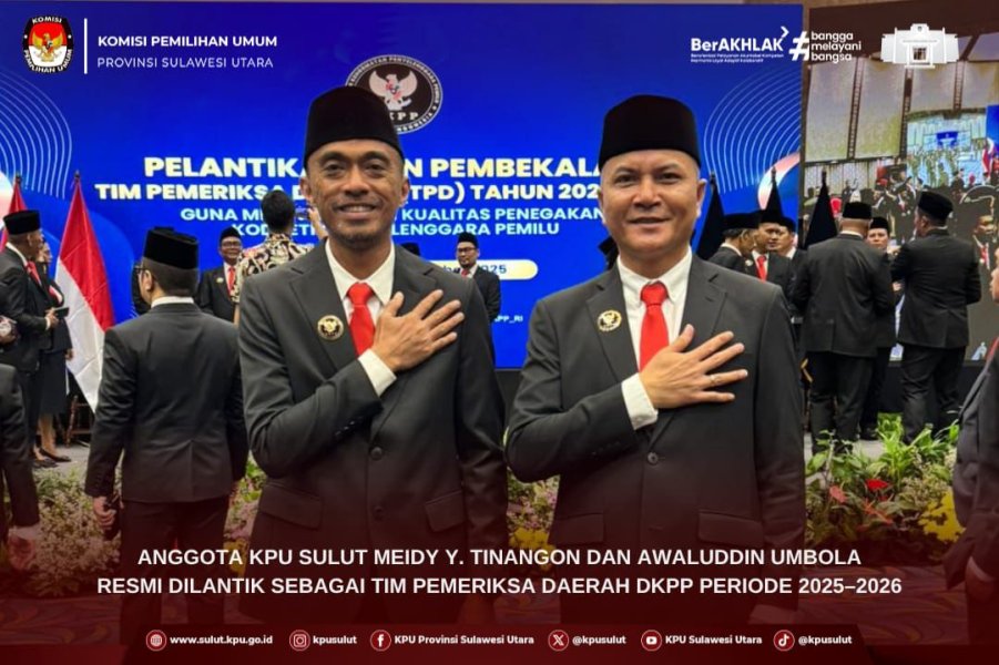 KPU Provinsi Sulawesi Utara menyampaikan selamat dan sukses kepada Kedua Anggota KPU Sulut Meidy Y. Tinangon dan Awaluddin Umbola atas pelantikan sebagai Tim Pemeriksa Daerah DKPP unsur KPU Provinsi Sulawesi Utara Periode 2025–2026.