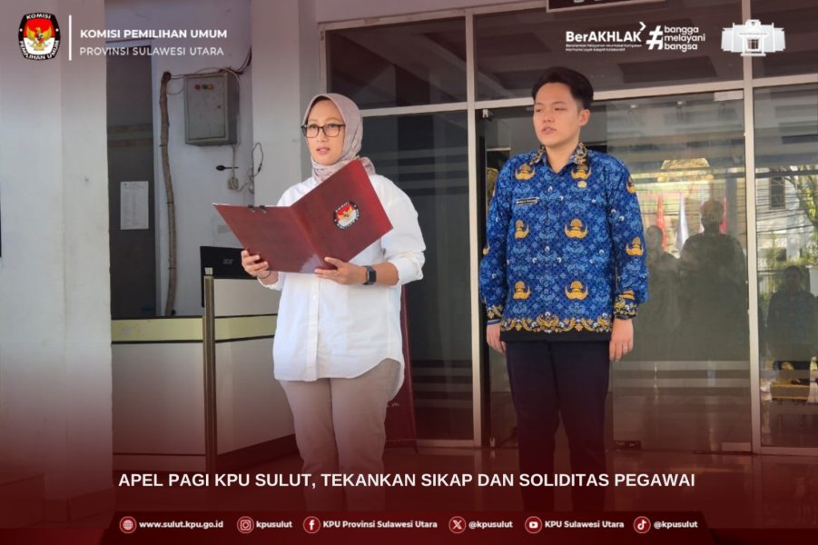Apel pagi dihadiri oleh Sekretaris KPU Sulut, Meidy Malonda, pejabat struktural, pejabat fungsional, serta seluruh pegawai dilingkungan KPU Sulut. Apel pagi berlangsung tertib dan menjadi momentum untuk memperkuat komitmen dalam melaksanakan tugas dan fungsi secara professional.