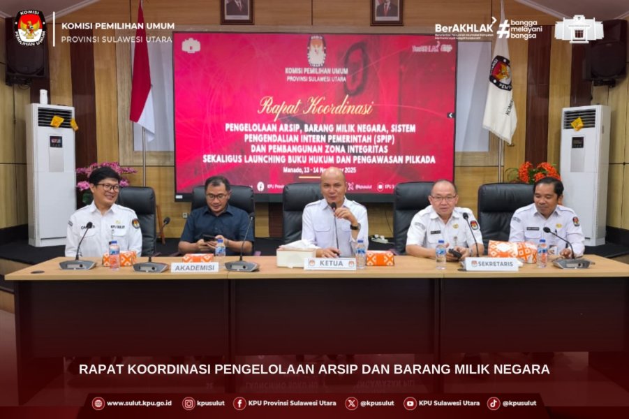 Manado,sulut.kpu.go.id - Bertempat di Aula KPU Sulut diselenggarakan Rapat Koordinasi Pengelolaan Arsip dan Barang Milik Negara pada Hari Kamis, 13 November 2025 yang dihadiri oleh Ketua, Sekretaris dan Kepala Sub Bagian Keuangan, Umum dan Logistik KPU Kabupaten/Kota Se-Sulawesi Utara, Jajaran KPU Provinsi Sulawesi Utara hadir Plh Ketua KPU Provinsi Sulawesi Utara, Sekretaris KPU Provinsi Sulawesi Utara, Kepala Bagian Umum dan Logistik KPU Sulut, Kepala Bagian Hukum dan Teknis Penyelenggaraan Pemilu KPU Sulut Serta Pelaksana pada Sekretariat KPU Sulut.