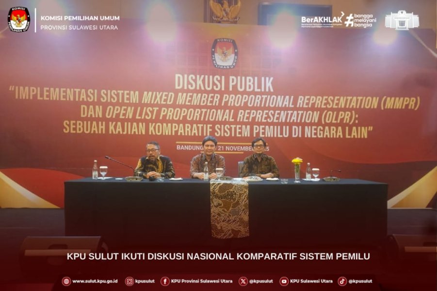 Bandung, sulut.kpu.go.id — Ketua KPU Sulut Kenly Poluan bersama Ketua Divisi Teknis Penyelenggaraan Salman Saelangi mengikuti Diskusi Publik bertema “Implementasi Sistem Mixed Member Proportional Representation (MMPR) dan Open List Proportional Representation (OLPR): Sebuah Kajian Komparatif Sistem Pemilu di Negara Lain” yang diselenggarakan oleh KPU Republik Indonesia pada 18–21 November 2025 di Hotel Aryaduta Bandung.