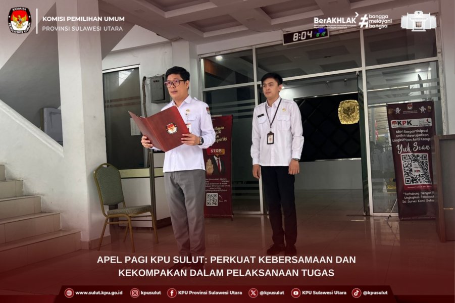 Apel dipimpin oleh Kepala Subbagian Teknis Penyelenggaraan Pemilu dan Partisipasi Masyarakat, Novie Runtakhu sementara bertindak selaku Pembina Apel Kepala Bagian Teknis Penyelenggaraan Pemilu, Parmas, Hukum dan SDM, Carles Worotitjan.