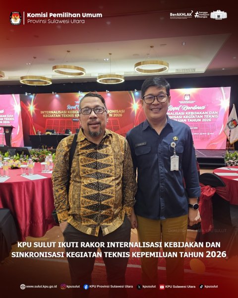Jakarta, sulut.kpu.go.id -Ketua Divisi Teknis Penyelenggaraan KPU Sulut Salman Saelangi dan Kabag Teknis Penyelenggaraan Pemilu dan Hukum KPU Sulut Carles Worotitjan mengikuti Rapat Koordinasi (Rakor) Internalisasi Kebijakan Dan Sinkronisasi Kegiatan Teknis Kepemiluan Tahun 2026 pada tanggal 2 s/d 4 Februari 2026 di Jakarta.