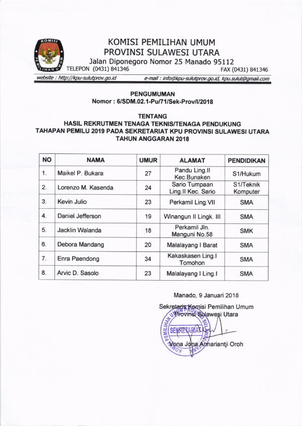 Komisi Pemilihan Umum (KPU) Provinsi Sulawesi Utara telah melaksanakan Tes Wawancara dan Kemampuan Ms. Office terhadap Calon Tenaga Teknis/Tenaga Pendukung Tahapan Pemilu 2019 Tahun Anggaran 2018. Berdasarkan Berita Acara Sekretariat KPU Provinsi Sulawesi Utara Nomor : 3/SDM.02.1-BA/01.2/Sek-Prov/I/2018 tentang Penetapan Hasil Seleksi Rekrutmen Tenaga Teknis/Tenaga Pendukung Tahapan Pemilu 2019 KPU Provinsi Sulawesi Utara Tahun Anggaran 2018, dengan ini diumumkan bahwa Nama-nama Tenaga Teknis/Tenaga Pendukung yang dinyatakan LULUS.