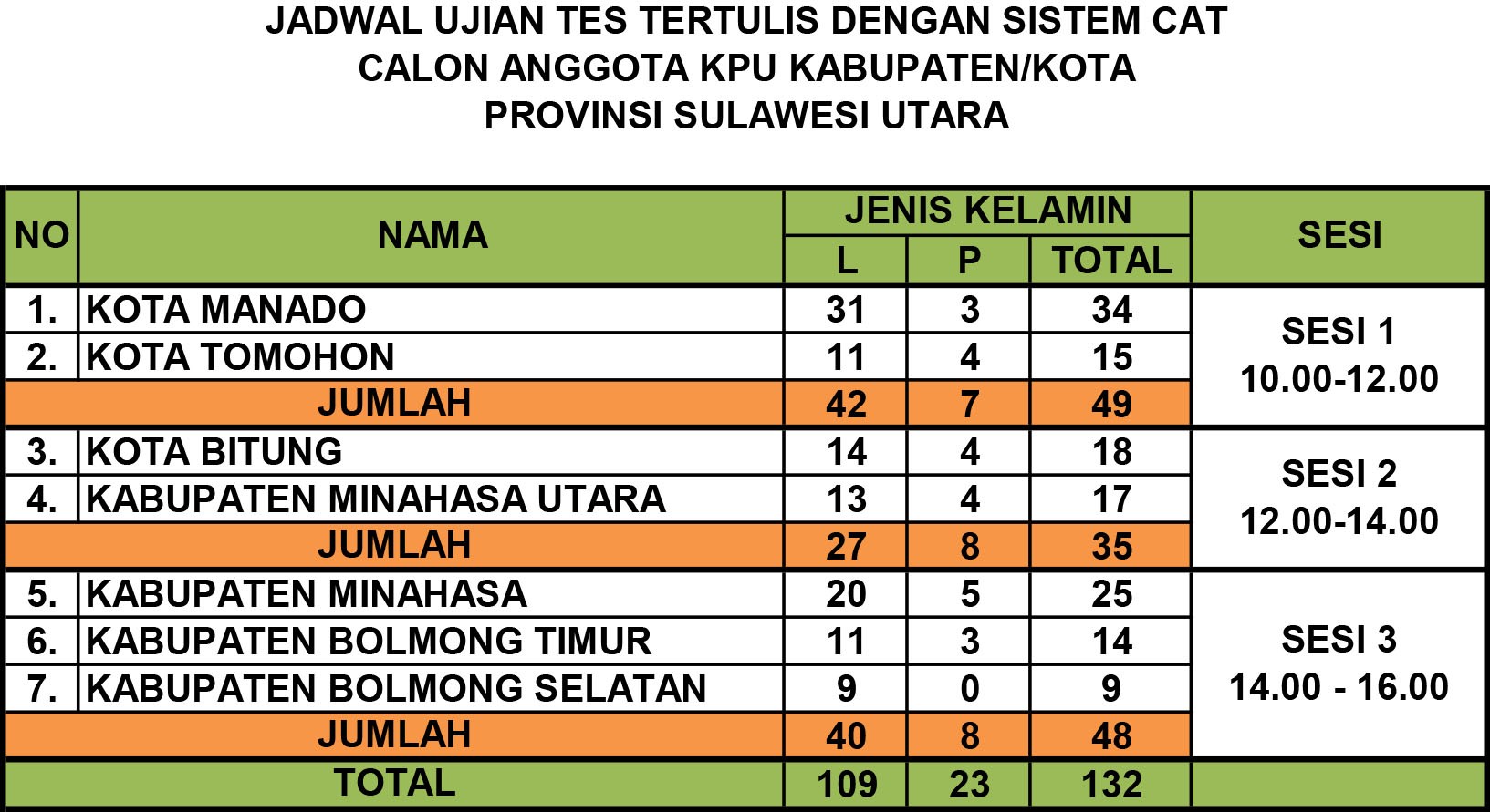 Informasi Pelaksanaan Tes Tertulis dengan Sistem CAT untuk Seleksi Calon Anggota KPU Kabupaten/Kota Provinsi Sulawesi Utara Periode 2018-2023 Jumat, 23 Maret 2018 00:00 340 Bagikan: Telah dilihat 340 kali