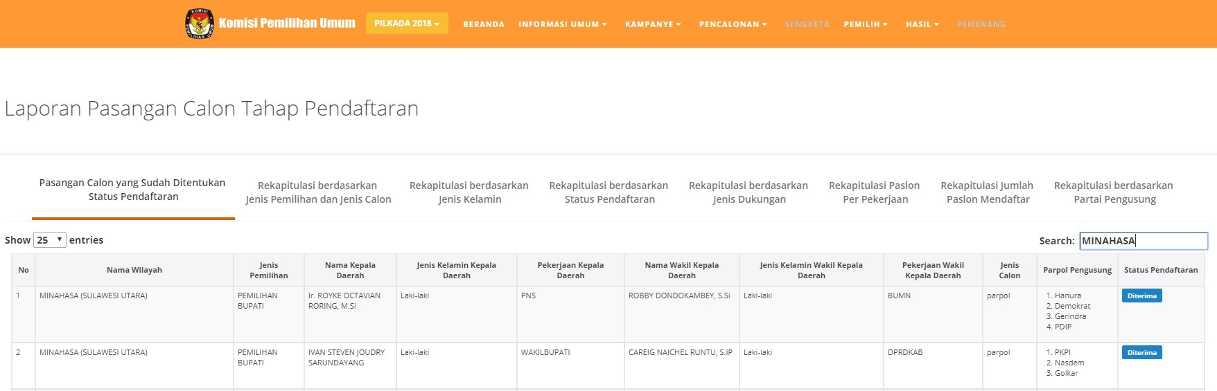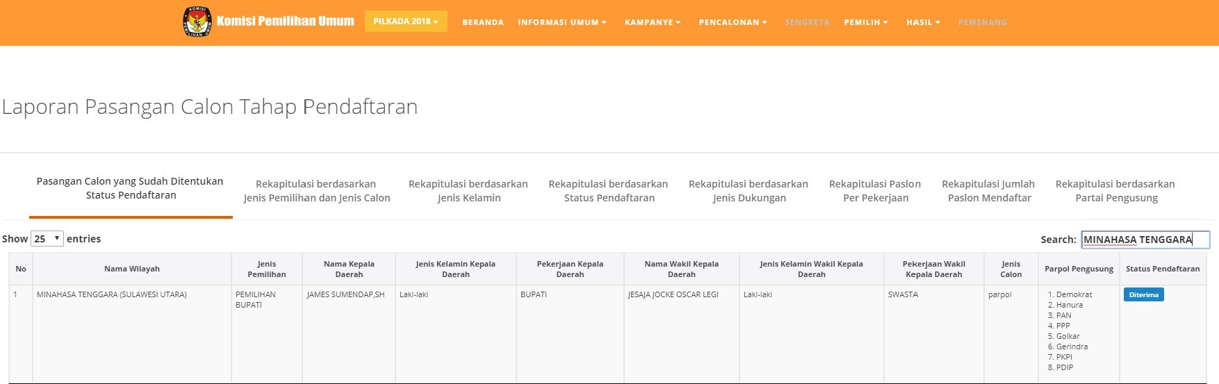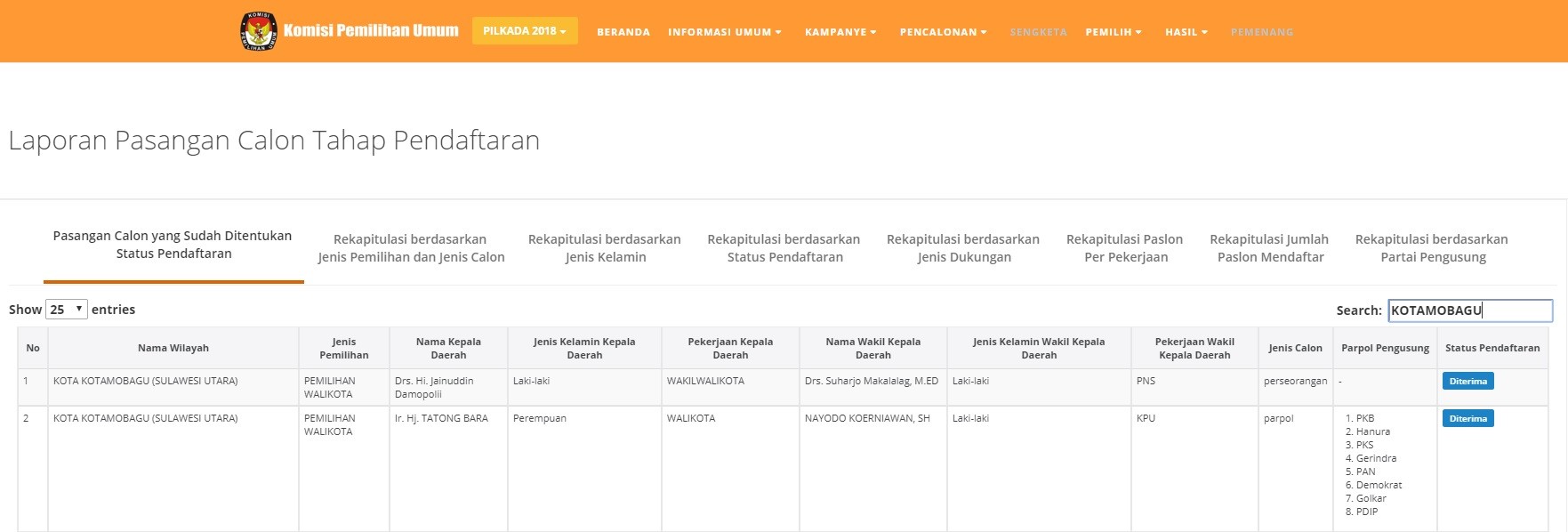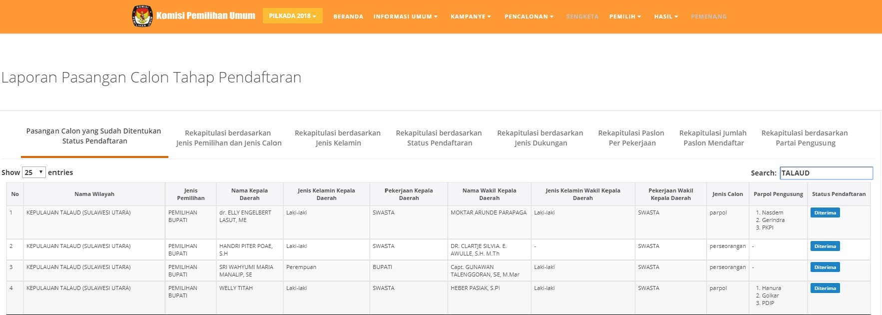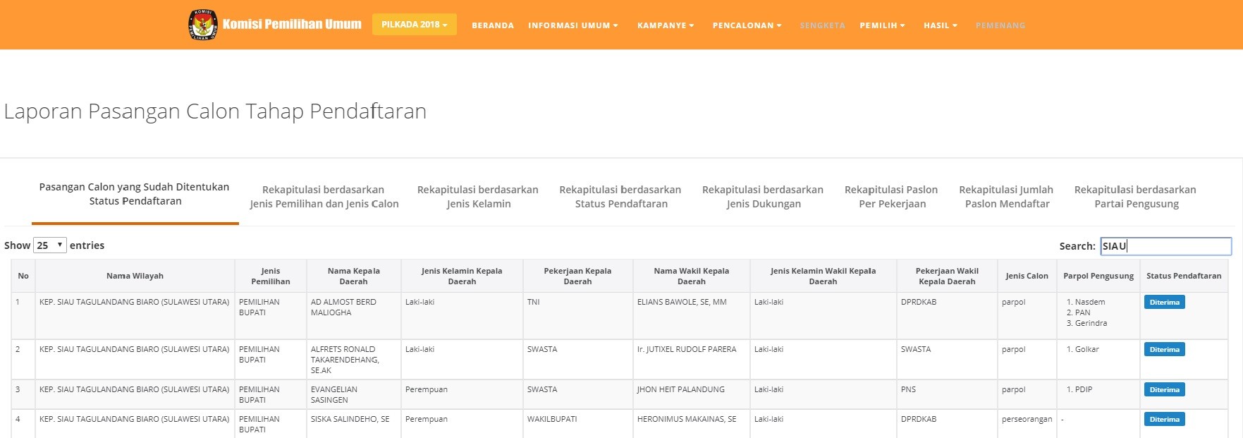 Sesuai dengan Tahapan KPU Kabupaten/Kota telah melakukan Penerimaan Pendaftaran Pasangan Calon pada tanggal 8 s.d 10 Januari 2018. Berdasarkan Data Pada Portal Pubikasi Pilkada dan Pemilu yang dapat di akses melalui : https://infopemilu.kpu.go.id/ berikut ini Pasangan Calon yang telah mendaftar di 6 KPU Kabupaten/Kota.