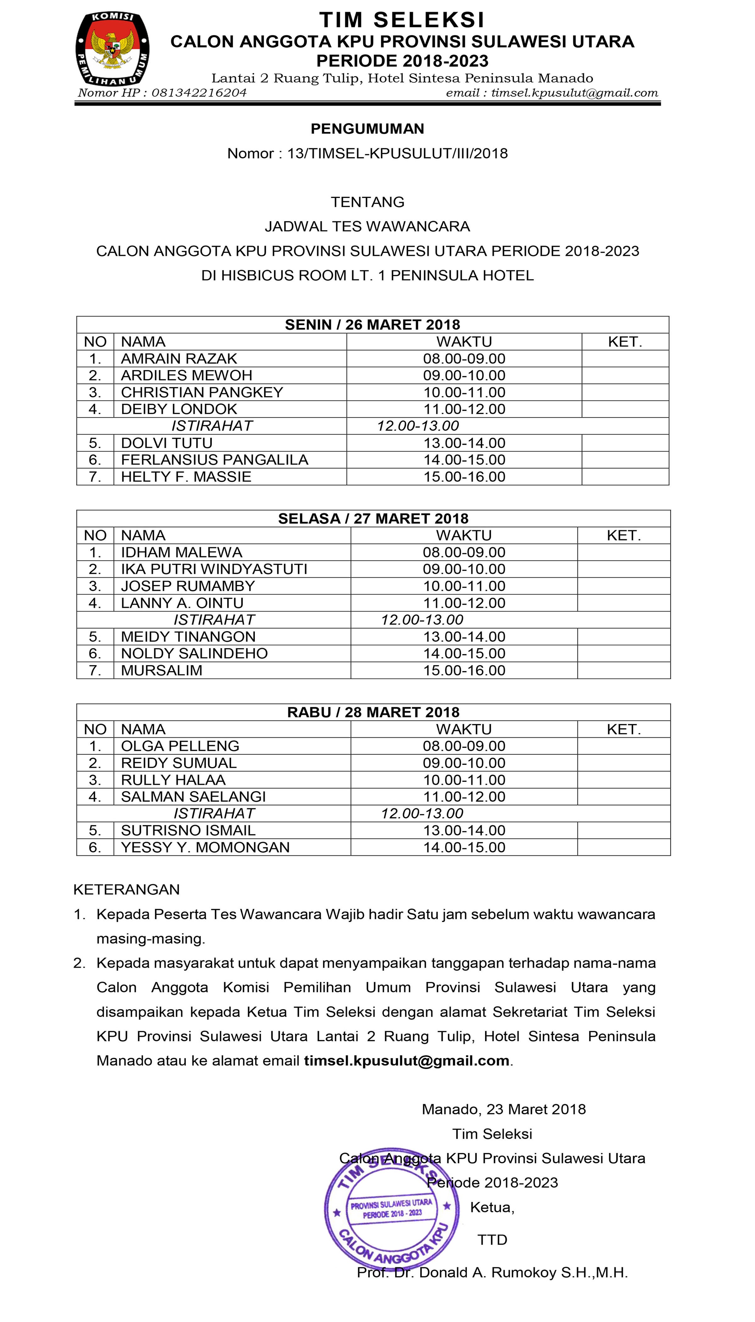 Jadwal Tes Wawancara Calon Anggota KPU Provinsi SULUT Periode 2018-2023 Jumat, 23 Maret 2018 00:00 337 Bagikan: Telah dilihat 337 kali