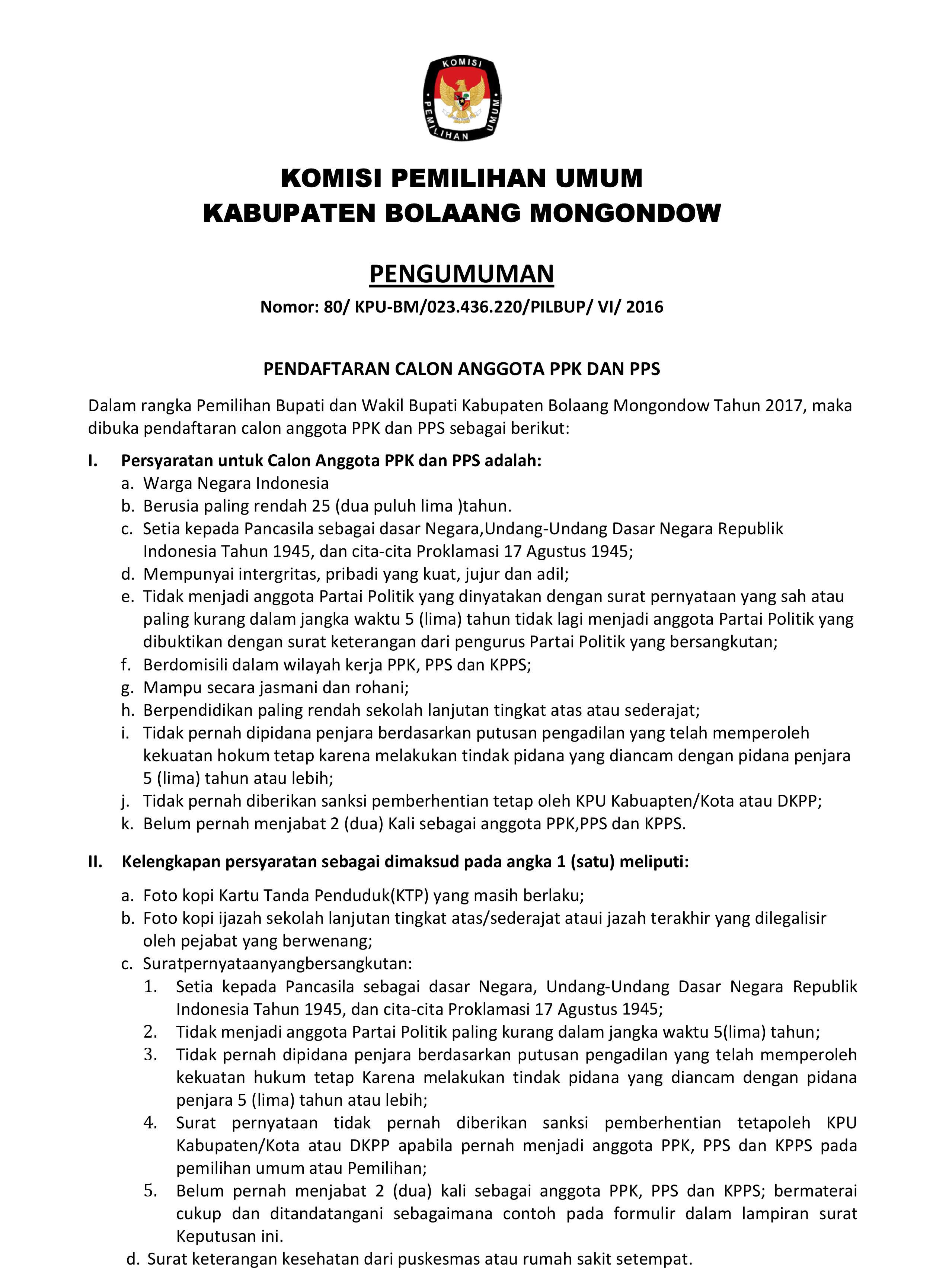 Untuk Pengumuman Pendaftaran Calon Anggota PPK dan PPS Pilkada 2017 Kabupaten Bolaang Mongondow download disini