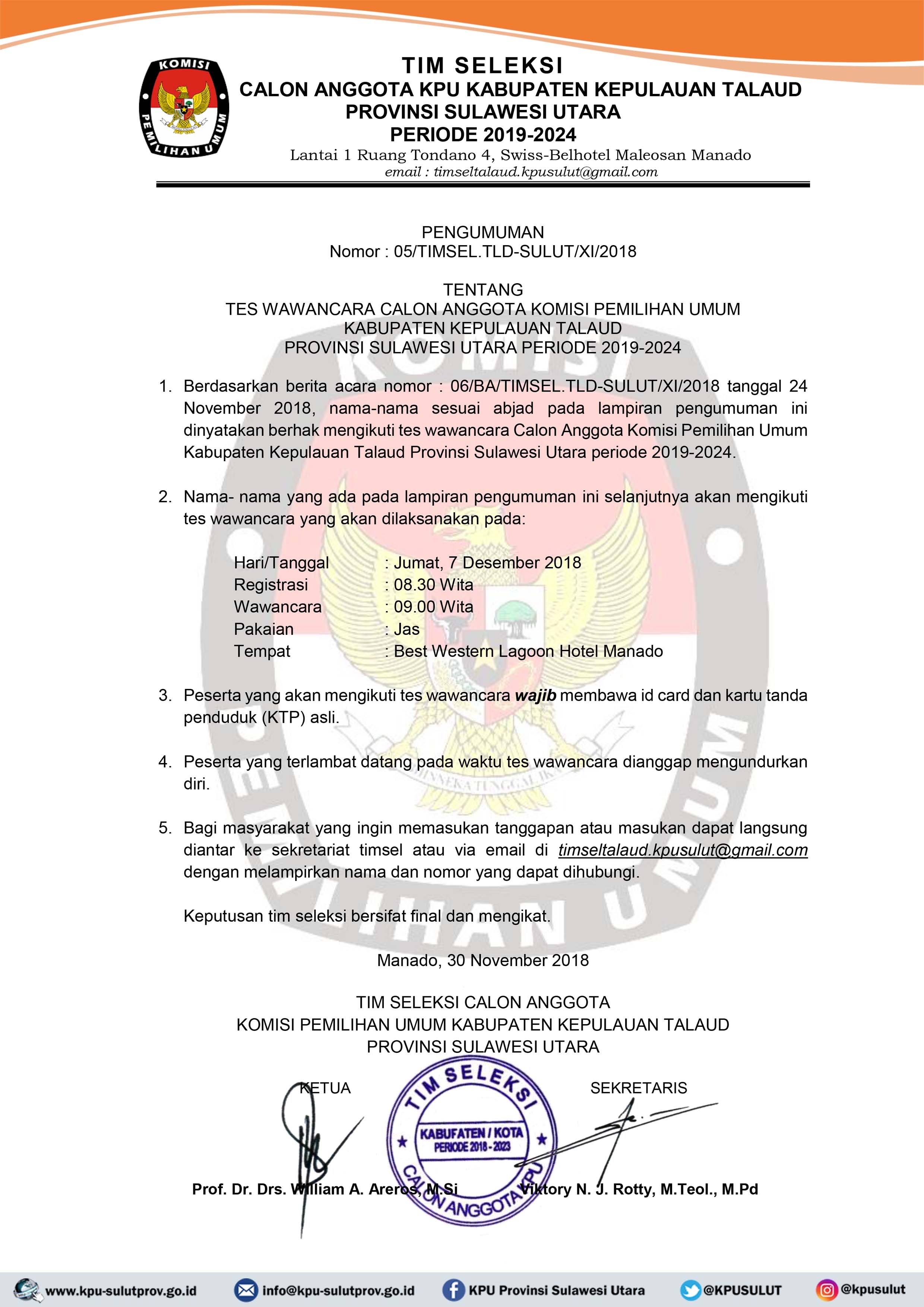Manado, sulut.kpu.go.id - Berdasarkan Berita Acara Nomor : 06/BA/TIMSEL.TLD-SULUT/XI/2018 tanggal 24 November 2018, nama-nama sesuai abjad pada lampiran Pengumuman dinyatakan Lulus Tes Psikologi akan mengikuti Tes Wawancara Calon Anggota Komisi Pemilihan Umum Kabupaten Kepulauan Talaud Provinsi Sulawesi Utara periode 2019-2024.