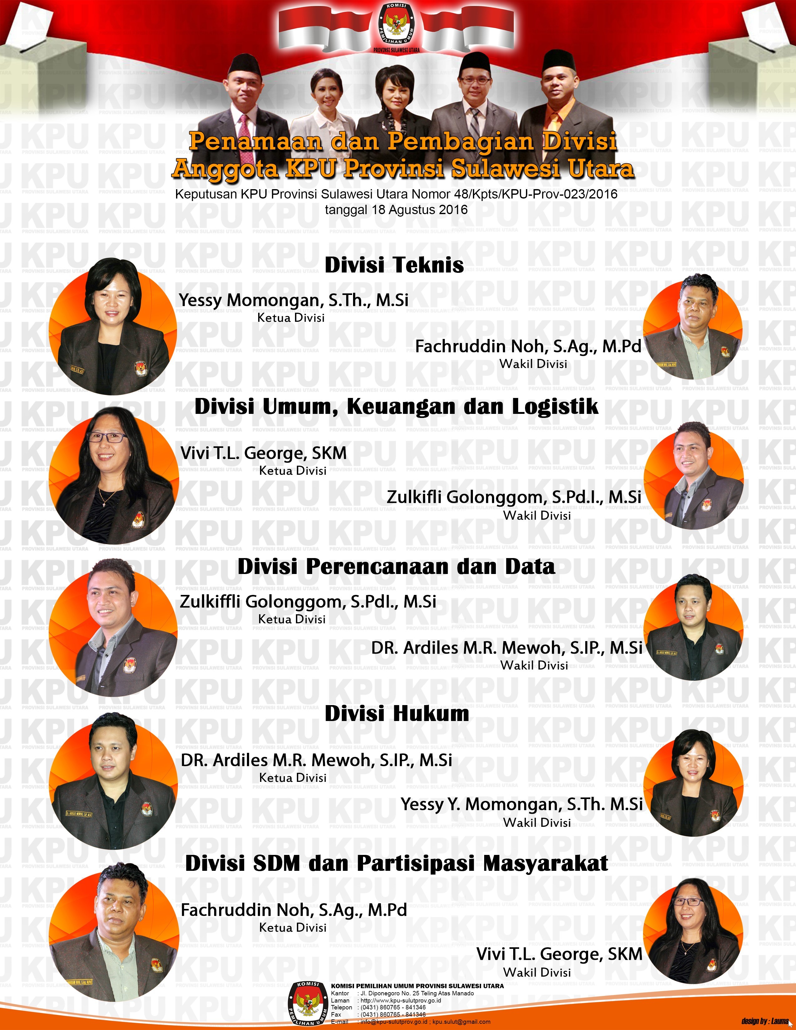 Penamaan dan Pembagian Divisi Anggota KPU Provinsi Sulawesi Utara sesuai dengan Keputusan KPU Provinsi Sulawesi Utara Nomor 48/Kpts/KPU-Prov-023/2016 tanggal 18 Agustus 2016