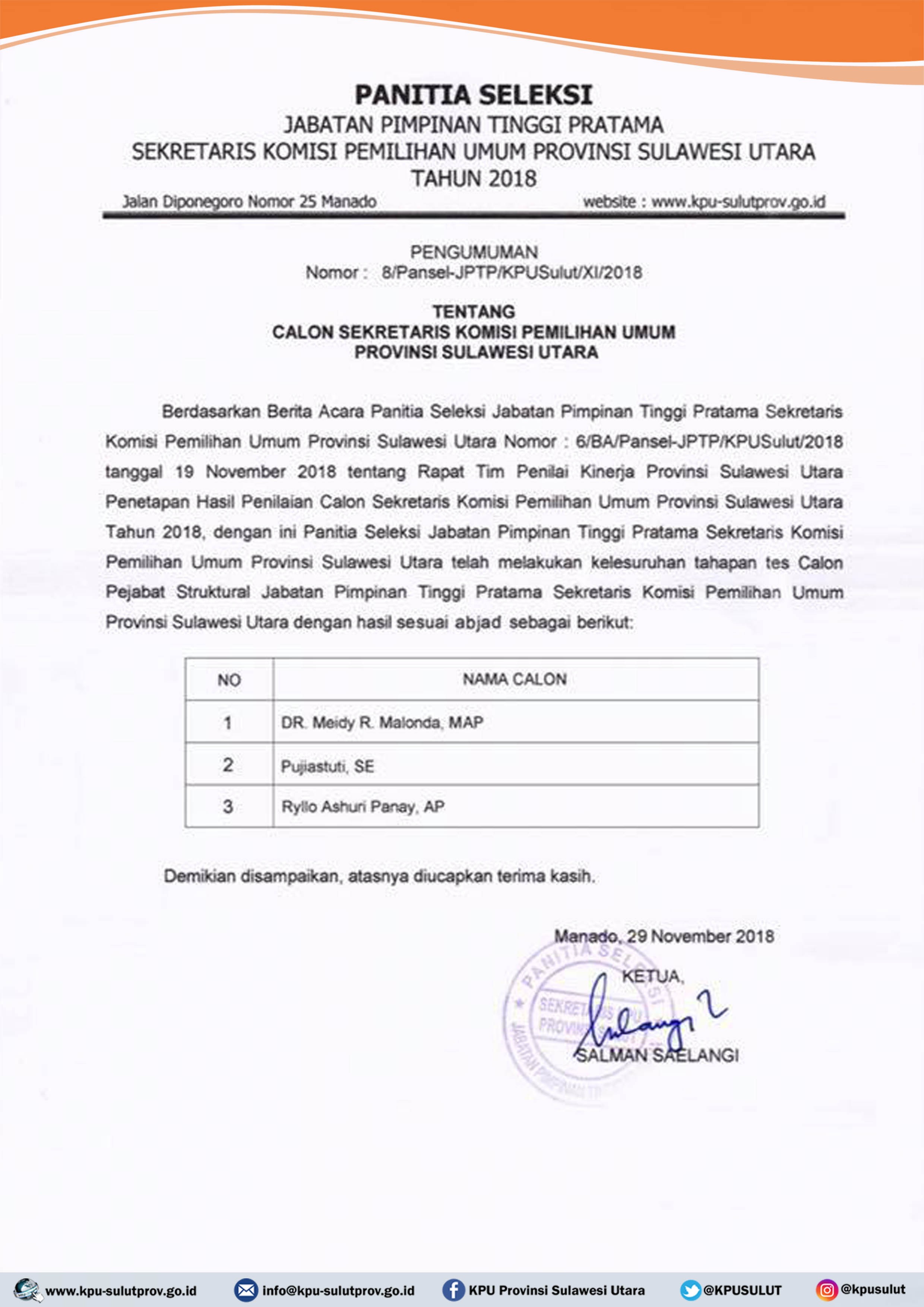 Manado, sulut.kpu.go.id - Pengumuman Panitia Seleksi Jabatan Tinggi Pratama Seleksi Sekretaris Komisi Pemilihan Umum Provinsi Sulawesi Utara Nomor : 8/Pansel-JPTP/KPUSulut/XI/2018 tentang Calon Sekretaris Komisi Pemilihan Umum Provinsi Sulawesi Utara