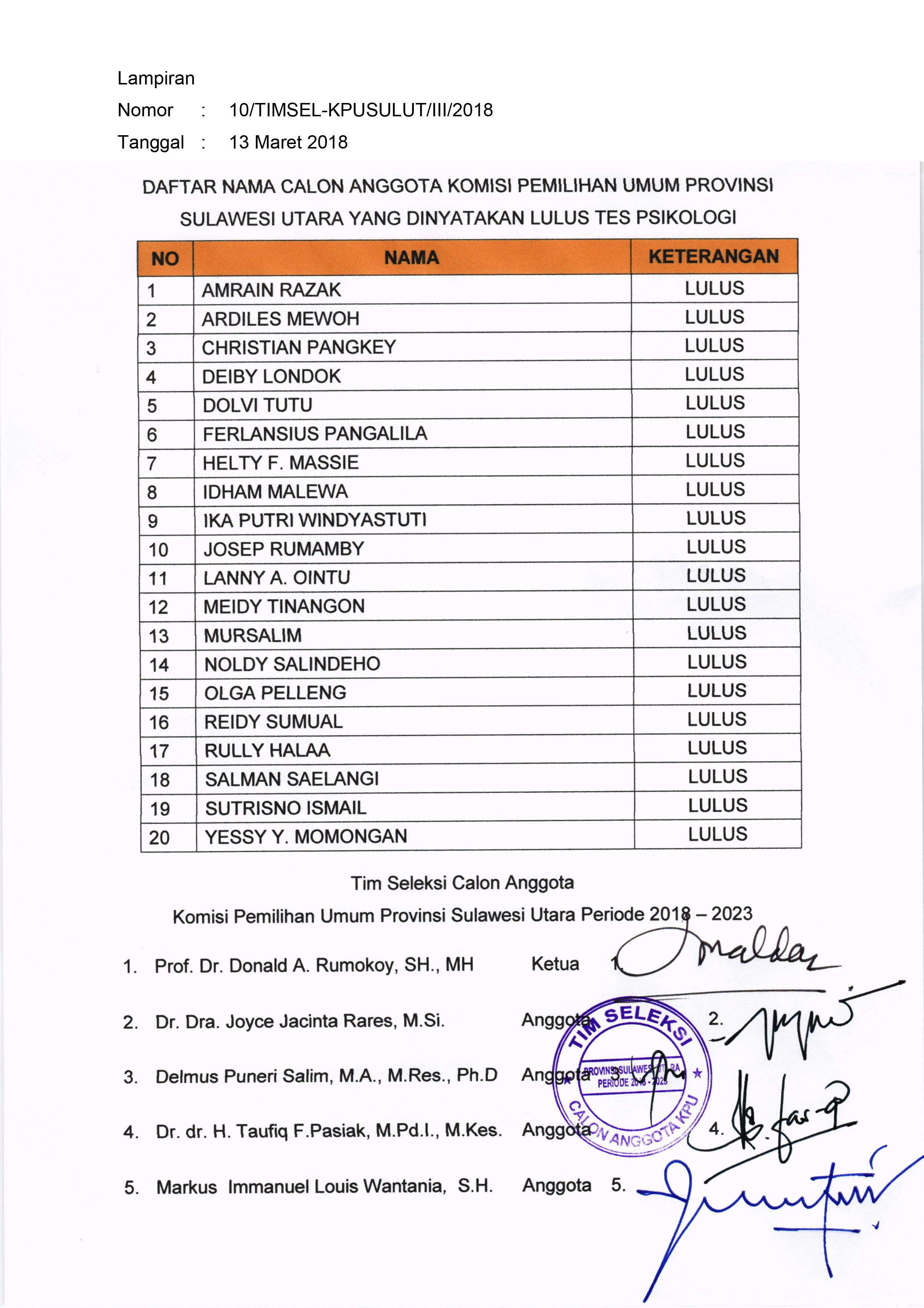 Berdasarkan Berita Acara Tim Seleksi Calon Anggota Komisi Pemilihan Umum Provinsi Sulawesi Utara Periode Tahun 2018 – 2023 Nomor : 8/BA/TIMSEL/KPU-SULUT/III/2018 tanggal 13 Maret 2018, bersama ini kami umumkan nama-nama yang dinyatakan Lulus Tes Psikologi :