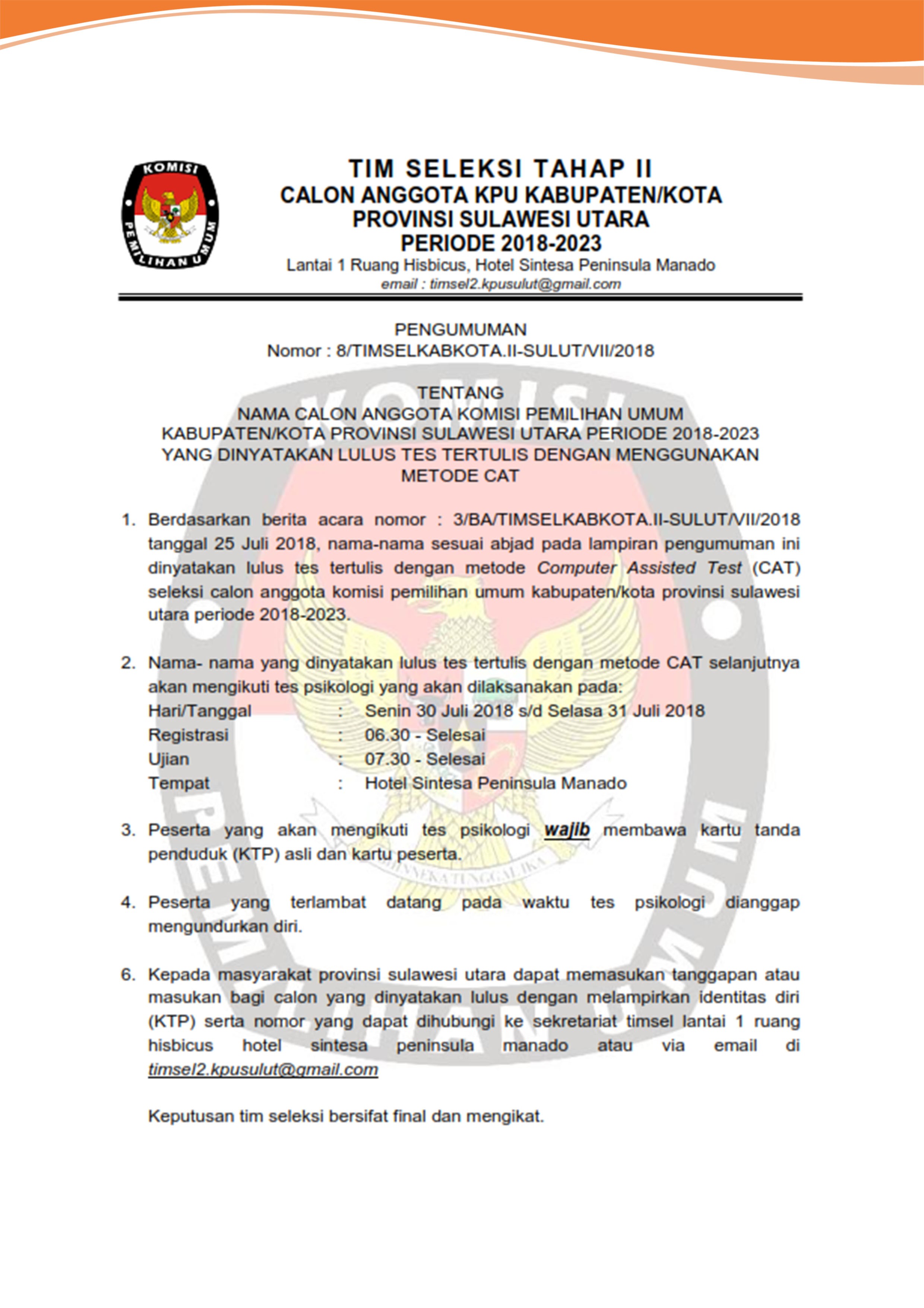 Pengumuman Tim Seleksi Tahap II Calon Anggota KPU Kabupaten/Kota Provinsi Sulawesi Utara Nomor : 8/TIMSELKABKOTA.II-SULUT/VII/2018 KLIK DISINI