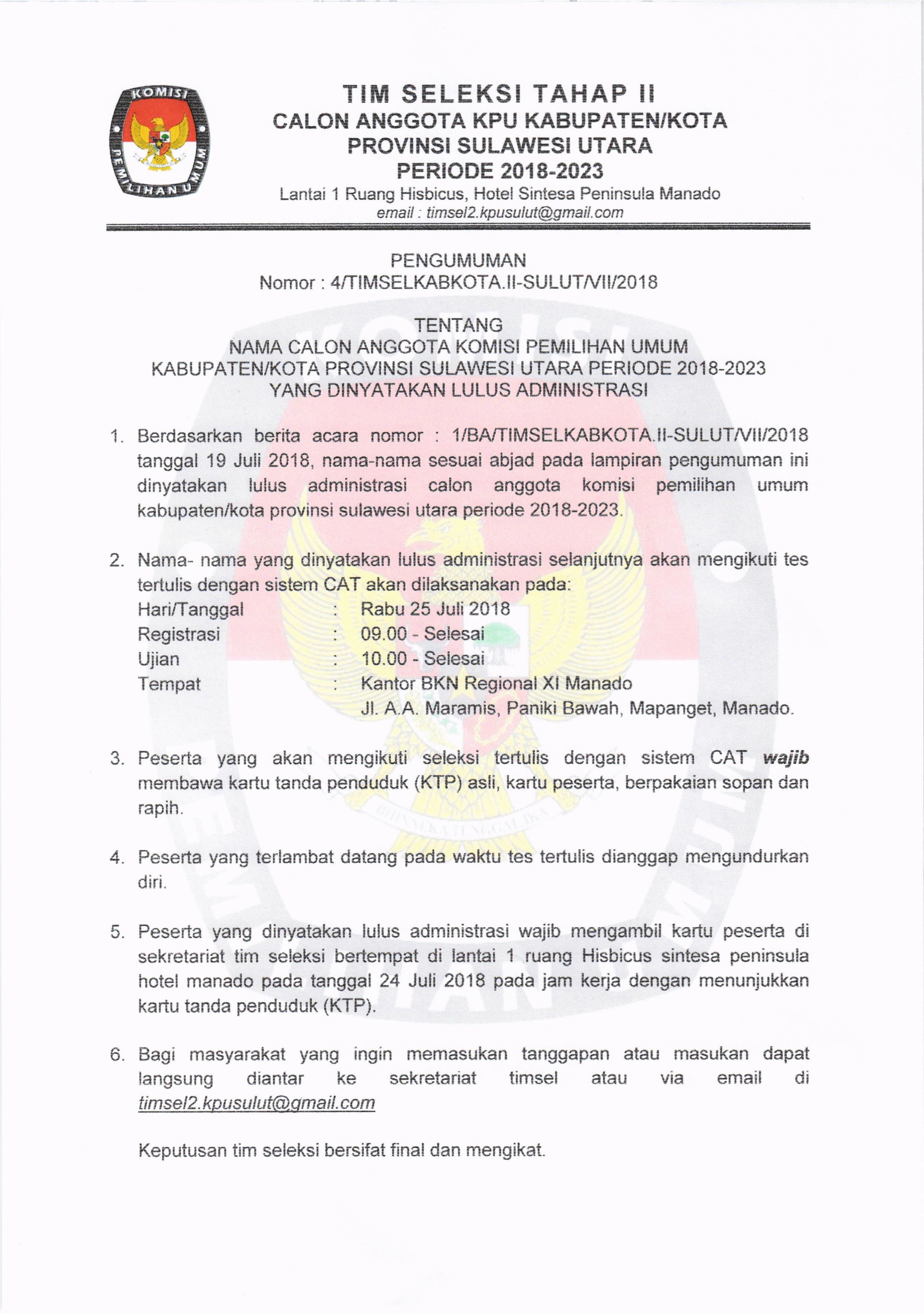 Tim Seleksi Tahap ll Calon Anggota Komisi Pemilihan Umum Kabupaten/Kota Provinsi Sulawesi Utara Periode 2018 - 2023 di 7 Kabupaten/Kota yang terdiri dari : Kabupaten Minahasa Tenggara, Kabupaten Minahasa Selatan, Kabupaten Bolaang Mongondow, Kabupaten Bolaang Mongondow Utara, Kota Kotamobagu, Kabupaten Kepulauan Sangihe dan Kabupaten Kepulauan Sitaro mengumumkan Nama- nama sesuai dengan Adjad yang dinyatakan Lulus Administrasi.