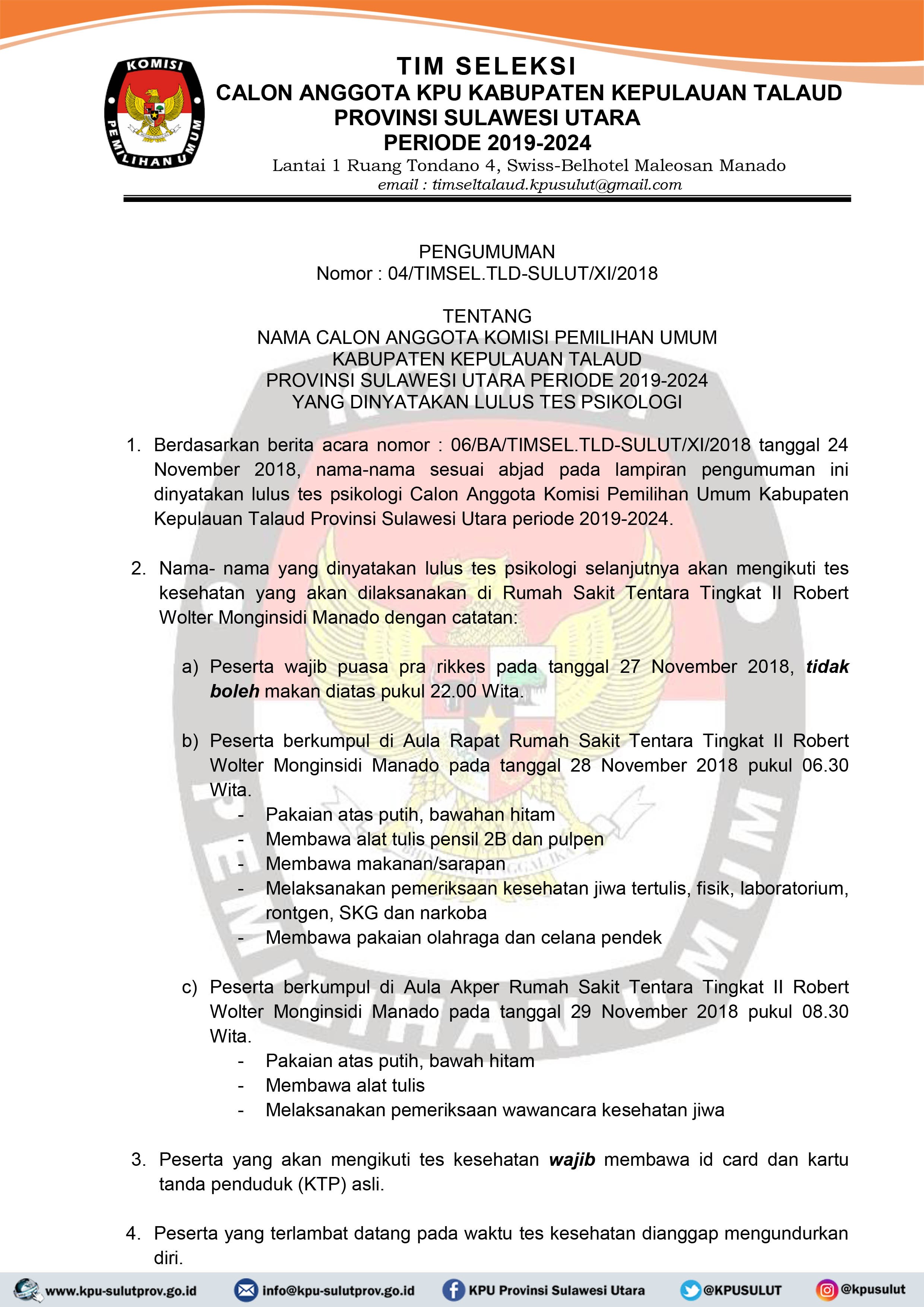 Manado, sulut.kpu.go.id - Berdasarkan Berita Acara nomor : 06/BA/TIMSEL.TLD-SULUT/XI/2018 tanggal 24 November 2018, nama-nama sesuai abjad pada lampiran pengumuman ini dinyatakan Lulus Tes Psikologi Calon Anggota Komisi Pemilihan Umum Kabupaten Kepulauan Talaud Provinsi Sulawesi Utara periode 2019-2024.