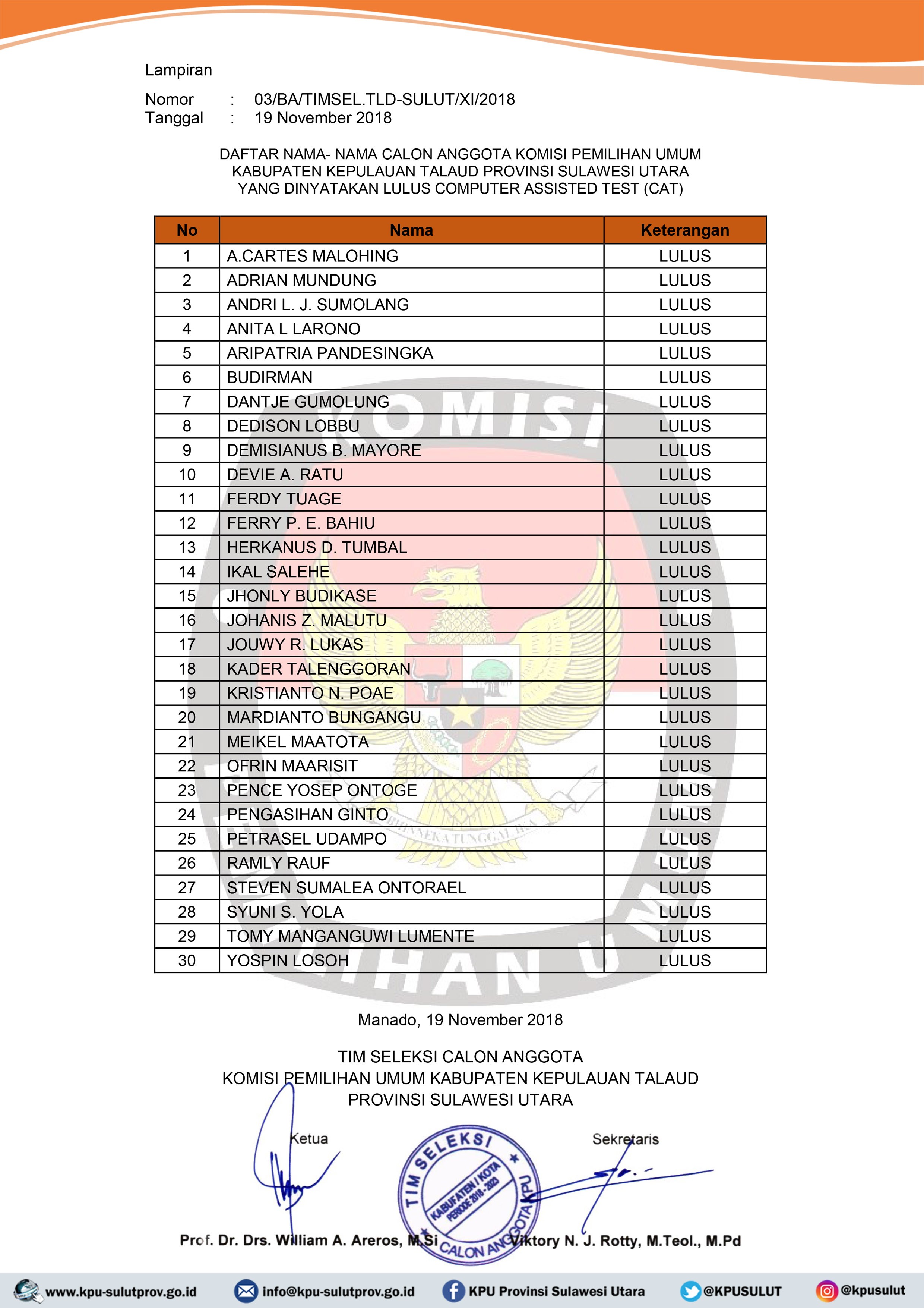 Manado, sulut.kpu.go.id - Berdasarkan Berita Acara Nomor: 03/BA/TIMSEL.TLD-SULUT/XI/2018 tanggal 19 November 2018, nama-nama sesuai abjad pada lampiran pengumuman ini dinyatakan Lulus Tes Tertulis dengan Metode CAT Calon Anggota Komisi Pemilihan Umum Kabupaten Kepulauan Talaud Provinsi Sulawesi Utara periode 2019 - 2024.