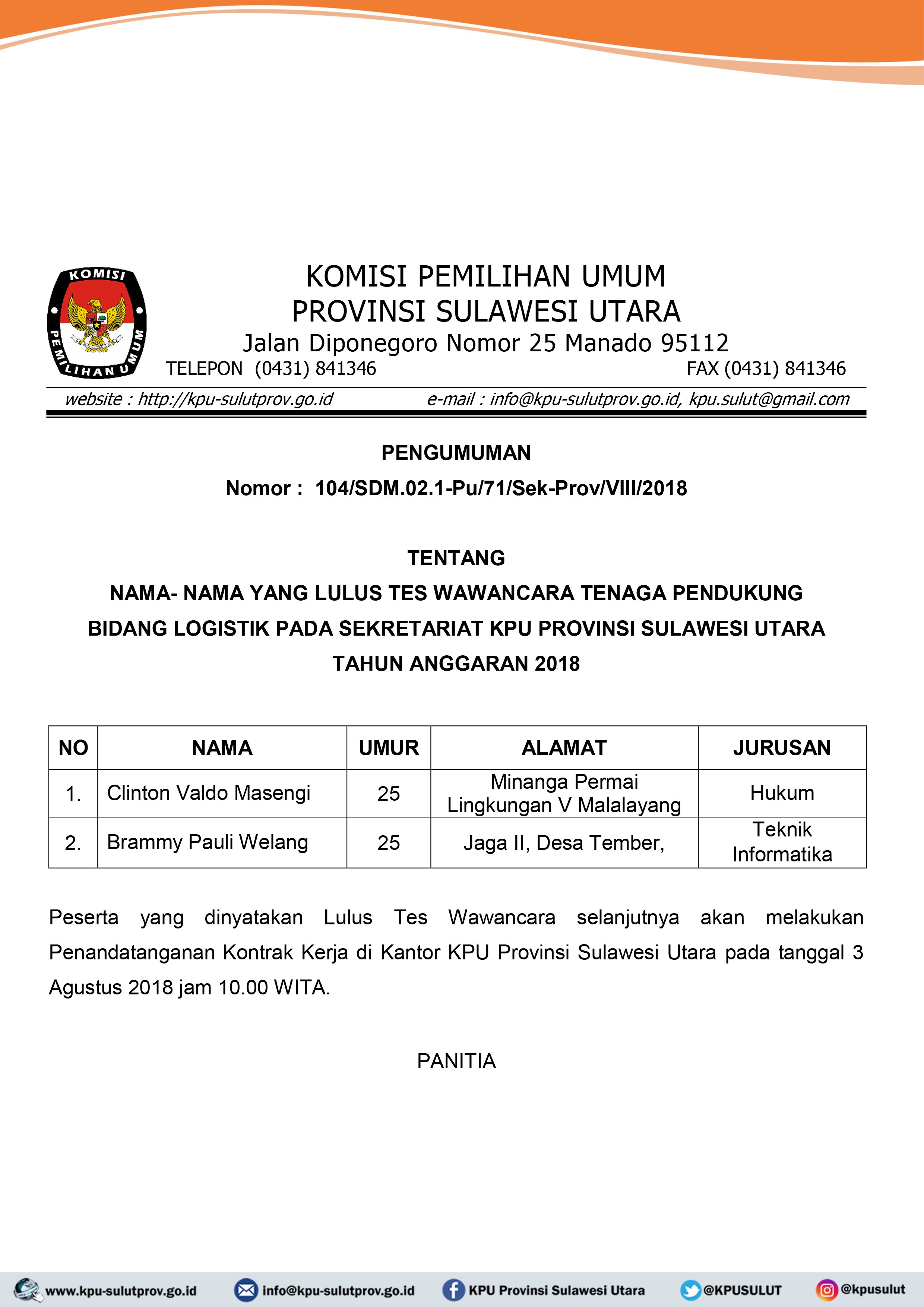 Manado, sulut.kpu.go.id - Berdasarkan Pengumuman Nomor : 104/SDM.02.1-Pu/71/Sek-Prov/VIII/2018 tentang Nama- nama yang Lulus Tes Wawancara sebagai Tenaga Pendukung Bidang Logistik di KPU Provinsi Sulawesi Utara Tahun Anggaran 2018 adalah sebagai berikut :