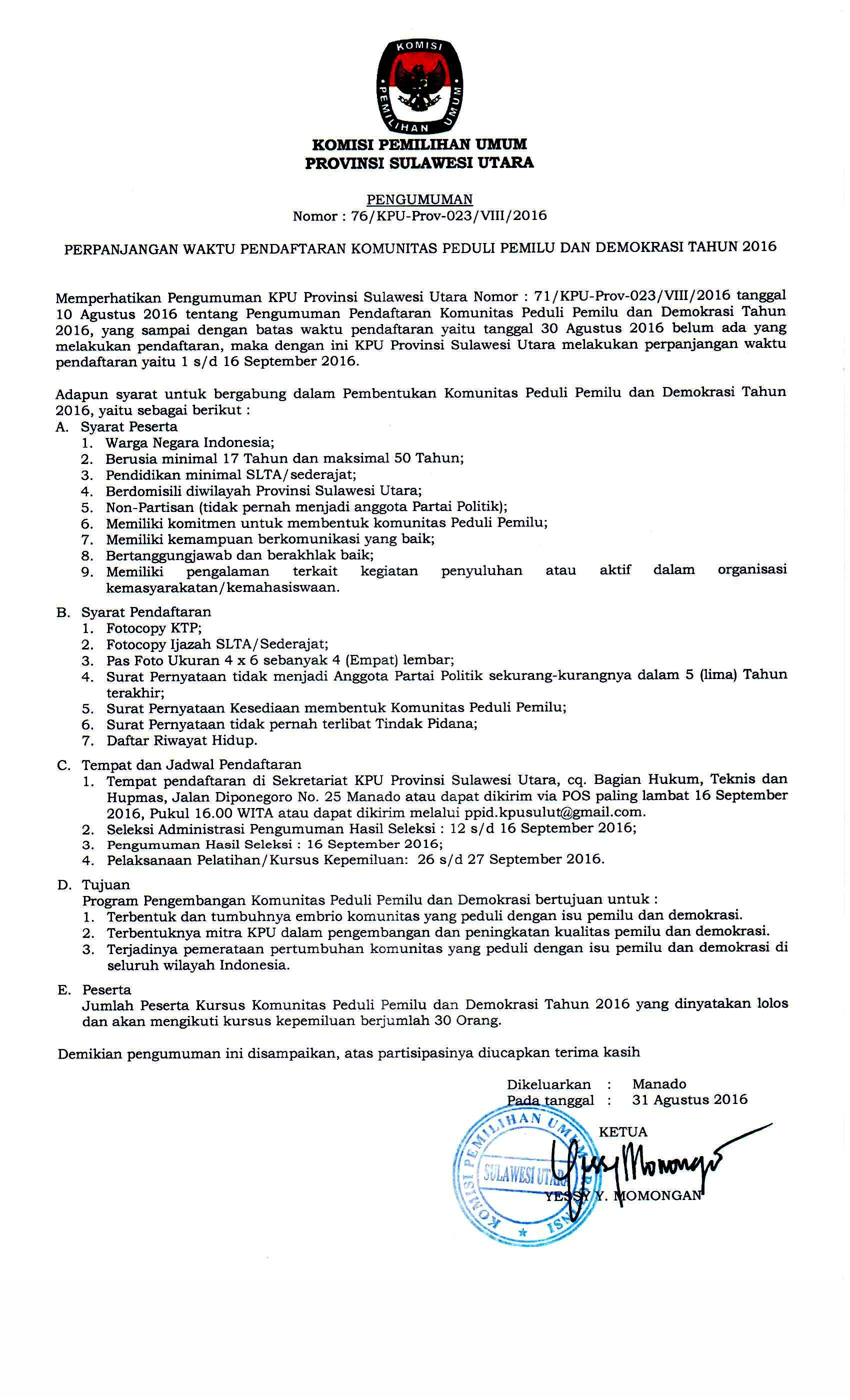 Pengumuman KPU Provinsi Sulawesi Utara Nomor : 76/KPU-Prov-023/VIII/2016 dapat didownload disini