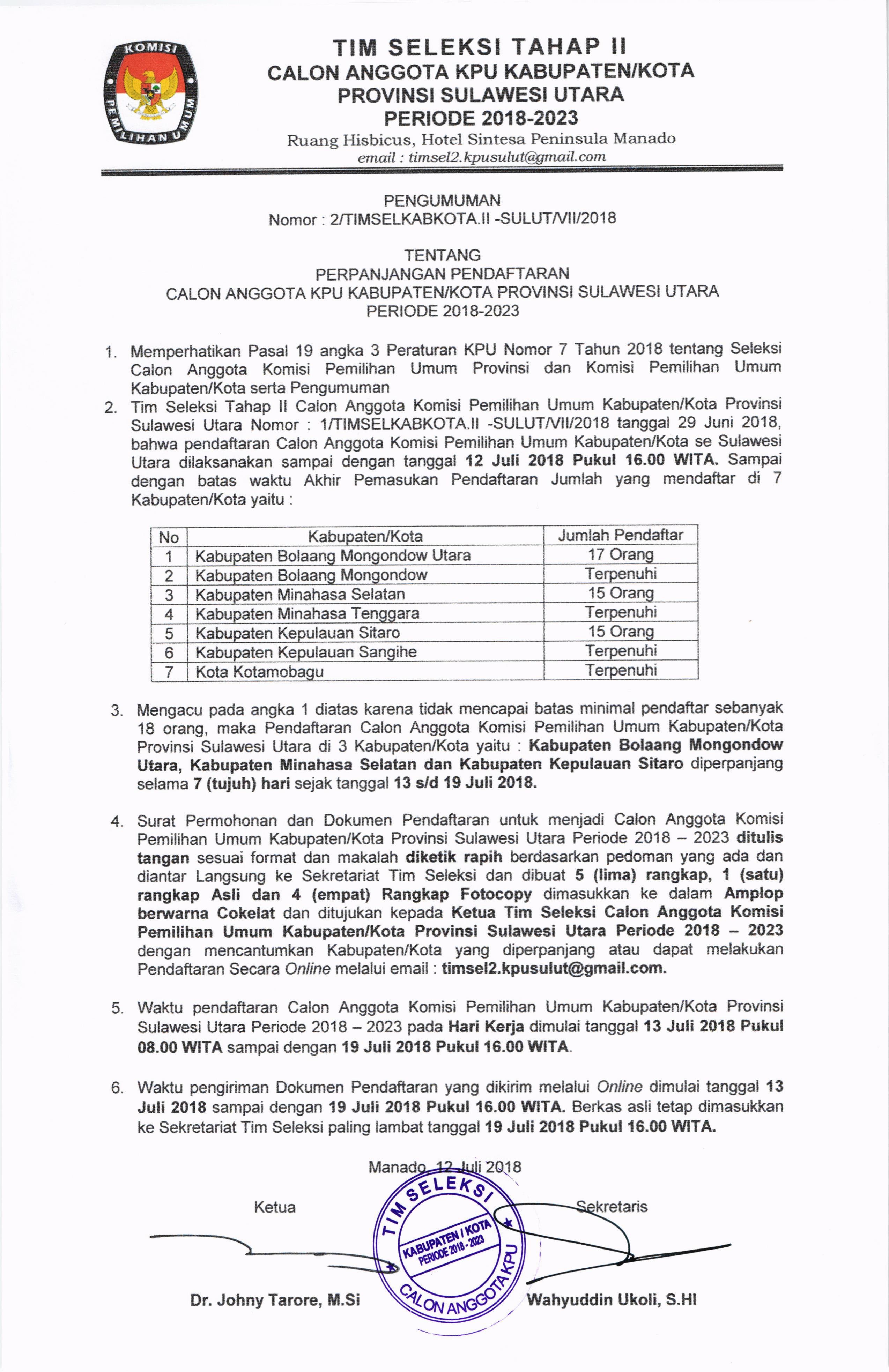 Manado, sulut.kpu.go.id - Memerhatikan Pasal 19 angka 3 Peraturan KPU Nomor 7 Tahun 2018 tentang Seleksi Calon Anggota Komisi Pemilihan Umum Provinsi dan Komisi Pemilihan Umum Kabupaten/Kota serta Pengumuman Tim Seleksi Tahap II Calon Anggota Komisi Pemilihan Umum Kabupaten/Kota Provinsi Sulawesi Utara Nomor : 1/TIMSELKABKOTA.II-SULUT/VII/2018 tanggal 29 Juni 2018,maka Pendaftaran Calon Anggota Komisi Pemilihan Umum Kabupaten/Kota Provinsi Sulawesi Utara di 3 Kabupaten Kota yaitu Kabupaten Minahasa Selatan, Kabupaten Bolaang Mongondow Utara dan Kabupaten Kepulauan Sitaro diperpanjang selama 7 hari yaitu tanggal 13 s/d 19 Juli 2018.