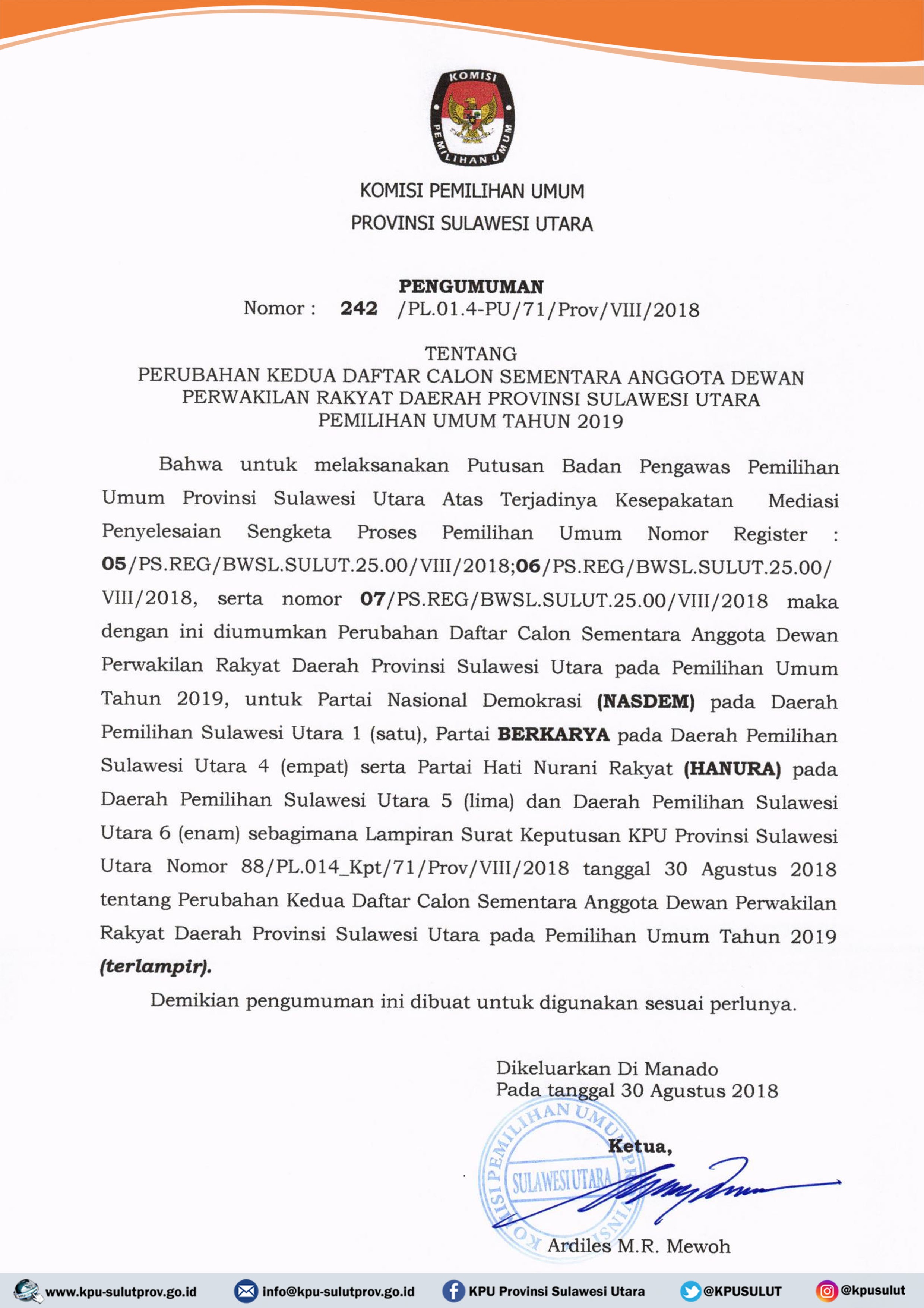 Manado, sulut.kpu.go.id -Bahwa untuk melaskanakan Putusan Badan Pengawas Pemilihan Umum Provinsi Sulawesi Utara atas terjadinya Kesepakataan Mediasi Penyelesaian Sengketa Proses Pemilihan Umum Nomor Registrasi : 05/PS.REG/BWSL.SULUT.25.00/VIII/201 dan Nomor : 06/PS.REG/BWSL.SULUT.25.00/VIII/2018 serta 07/PS.REG/BWSL.SULUT.25.00/VIII/2018 maka dengan ini diumumkan Perubahan Daftar Calon Sementara Anggota Dewan Perwakilan Rakyat Daerah Provinsi Sulawesi Utara pada Pemilu 2019.