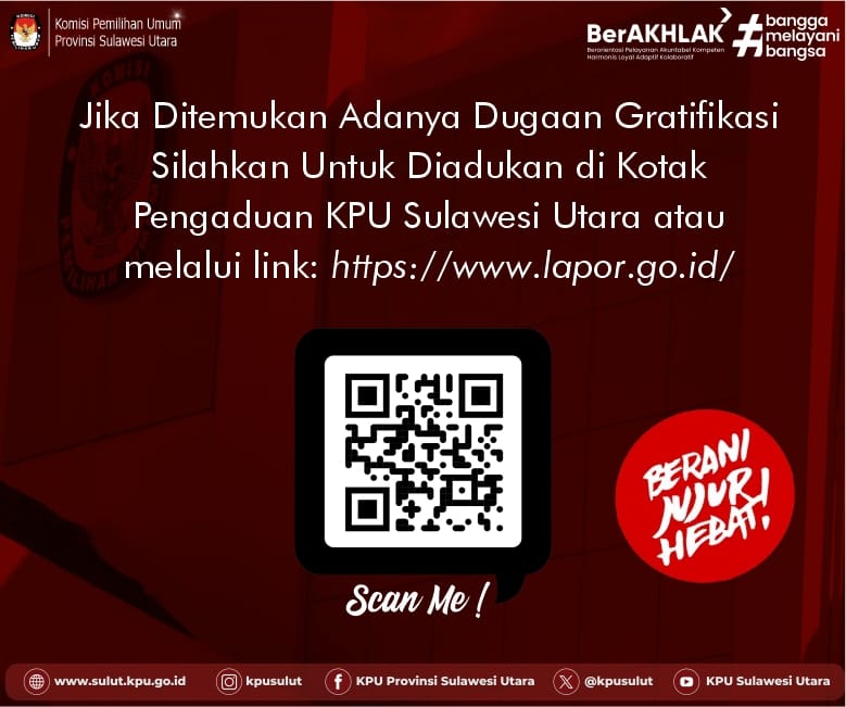 Apabila menemukan adanya dugaan Gratifikasi, Masyarakat dapat melaporkannya melalui kotak pengaduan KPU Sulawesi Utara atau melalui link berikut https://www.lapor.go.id/