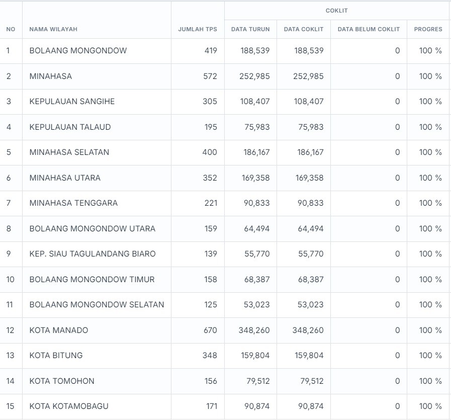 Pada hari ke -17 tanggal 10 Juli 2024 Tahapan Pencocokan dan Penelitian (coklit) oleh Pantarlih Provinsi Sulawesi Utara telah mencapai 100% progres Coklit Baik secara manual maupun melalui e-coklit.
