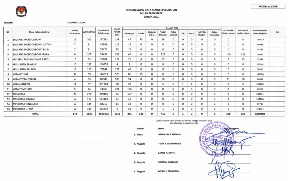 Dalam rapat pleno yang dipimpin Ketua KPU Sulut Ardilles M.R. Mewoh juga dihadiri oleh Ketua Divisi Program Data dan Informasi Ibu Lanny Ointu, Ketua Divisi Hukum dan Pengawasan Bpk Meidy Tinangon serta Kabag PDOS Raymond Mamahit dan Kasub Program dan Data Lani Alou. Rapat Pleno menetapkan rekapitulasi PDPB tingkat Provinsi Sulut sebanyak 1.850.808 pemilih yang meliputi 935.336 pemilih laki-laki dan 915.462 pemilih perempuan yang tersebar di 15 KPU Kabupaten/Kota, 171 kecamatan dan 1.839 desa/kelurahan se- Sulut.