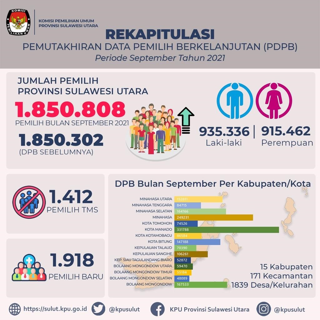 Hasil rekapitulasi periode bulan September 2021 tersebut, jika dibandingkan dengan rekapitulasi bulan sebelumnya atau periode Agustus 2021 yang berjumlah 1.850.302 pemilih, maka selang sebulan terjadi penambahan jumlah pemilih sebesar 506 pemilih.