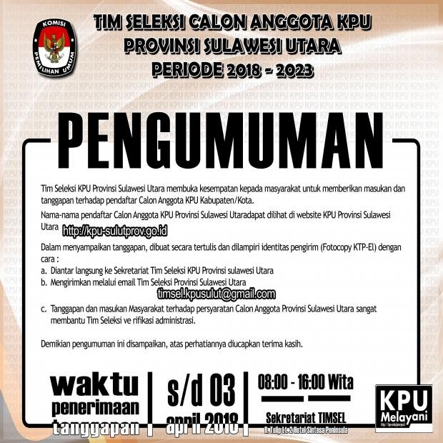 Tanggapan Masyarakat Atas Calon Anggota KPU Provinsi Sulawesi Utara Periode 2018-2023 Senin, 05 Maret 2018 00:00 332 Bagikan: Telah dilihat 332 kali