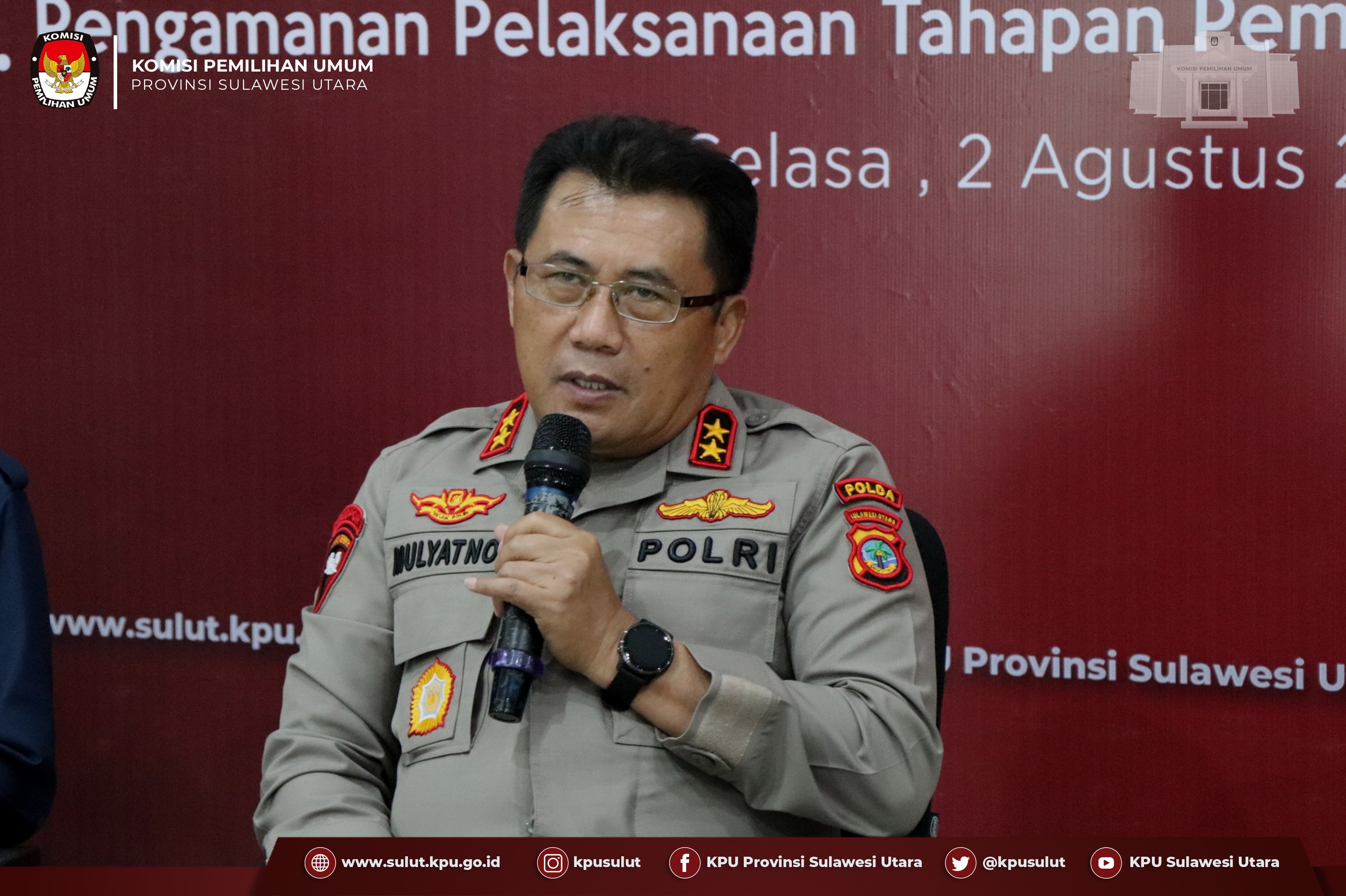 Manado, sulut.kpu.go.id - KPU Sulut menggelar webinar seri 3, mengusung tema Potensi Kerawanan Konflik dan Strategi Pengamanan Tahapan Pemilu Serentak Tahun 2024. Kegiatan tersebut dilaksanakan secara hybrid pada hari Selasa (03/08/2022). KPU Sulut menghadirkan Kepala Kepolisian Daerah (Kapolda) Sulut Irjen Pol. Mulyatno sebagai narasumber.