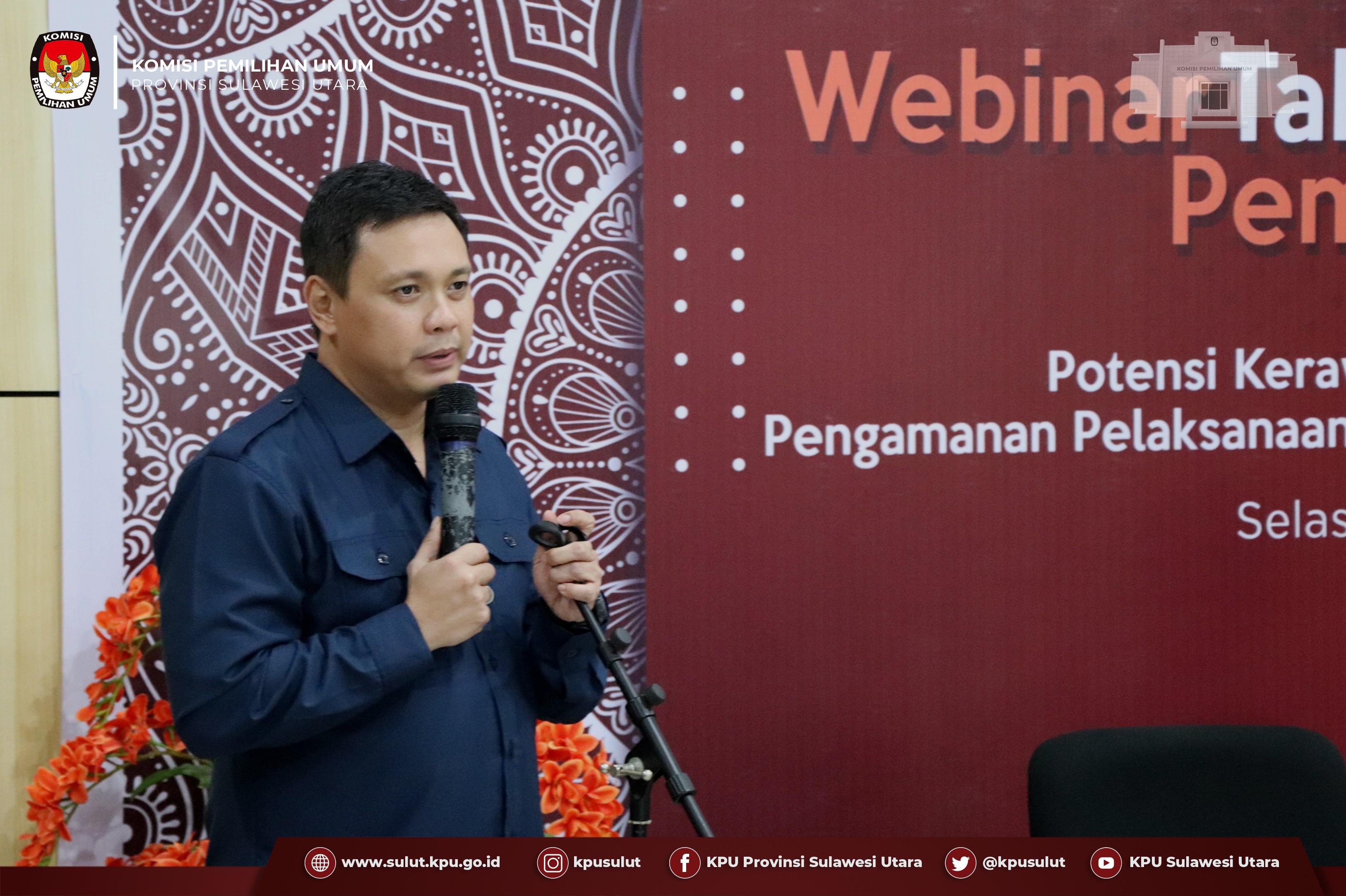 Webinar dibuka langsung oleh Ketua KPU Sulut Ardilles Mewoh. Dalam sambutan Mewoh menjelaskan, tahapan pemilu 2024 sementara berjalan, saat ini tahapan pendaftaran partai politik di KPU RI. Tentunya KPU membutuhkan kerjasama dengan Kepolisian Republik Indonesia (Polri) untuk pengamanan tahapan Pemilu. Mewoh berharap, webinar ini dimanfaatkan sebaik mungkin oleh KPU Kabupaten/Kota untuk mengetahui potensi kerawanan konflik saat Tahapan pemilu 2024 serta bentuk pengamanan yang dilakukan Kepolisian.