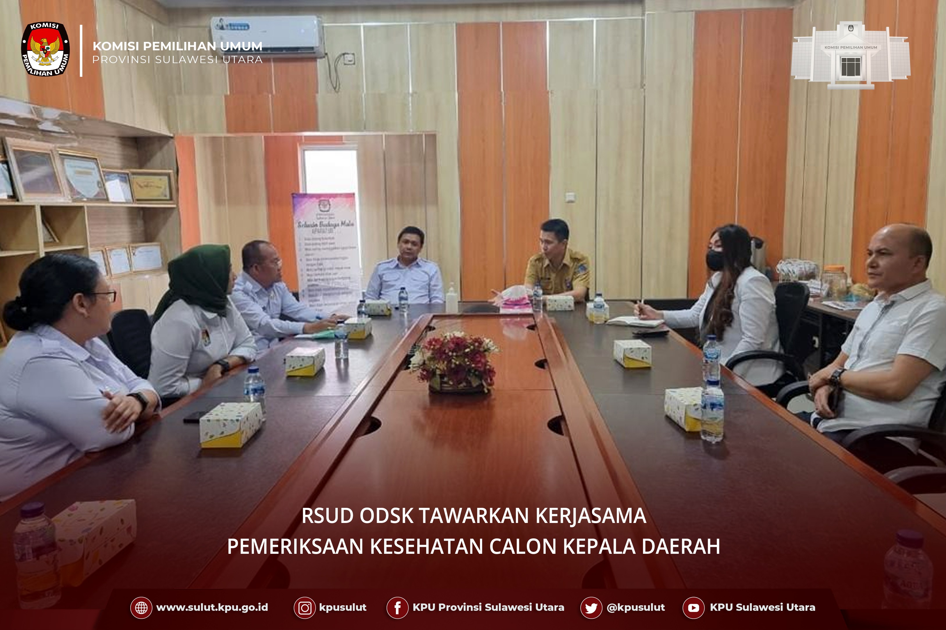 Manado - sulut.kpu.go.id Pimpinan Rumah Sakit Umum Daerah (RSUD) ODSK Provinsi Sulut mendatangi kantor KPU Sulut pada hari senin (29/8). Direktur RSUD ODSK dr. Enrico Hence Rawung MARS memimpin langsung rombongan tersebut dan diterima oleh Ketua KPU Sulut Ardiles Mewoh didampingi Anggota KPU Sulut Yessy Momongan, Meidy Tinangon dan Lanny Ointu. Rawung menyampaikan maksud kedatangan untuk menawarkan kerjasama fasilitas kesehatan pada Pemilihan Kepala Daerah. “Kami siap menyediakan fasililitas yang terbaik untuk kebutuhan pemeriksaan kesehatan calon Kepala Daerah dalam Pemilihan nanti,” tutur Rawung. Disisi lain, dia juga memohon informasi standar yang dibutuhkan sehingga bisa dijadikan referensi dalam menyiapkan fasilitas. Pada kesempatan itu Mewoh mengapresiasi kunjungan Pimpinan RSUD ODSK Provinsi Sulut. Mewoh menyampaikan KPU Sulut sangat terbuka dengan tawaran kerjasama tersebut, jika dilihat dari aspek fasilitas RSUD ODSK sudah sangat lengkap, tetapi perlu untuk didiskusikan bersama lagi. Sementara itu Momongan mengatakan berkaca pada pemilihan sebelumnya ada beberapa pertimbangan yang menjadi acuan dan standar untuk KPU Sulut lakukan kerjasama dengan pihak rumah sakit. “Kami akan memberikan standar yang digunakan sebelumnya supaya RSUD ODSK bisa mempelajarinya sebagai bahan pertimbangan,” ujar Momongan Ikut hadir pada pertemuan itu Kepala Bagian Keuangan, Umum dan Logistik KPU Sulut Meidy Malonda. (Bb/Ed:GT/Foto by Wale Pemilu)