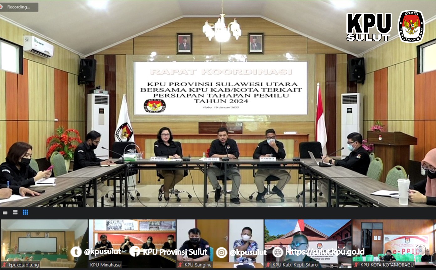 Mengawali agenda kerja KPU Prov. Sulut khususnya terkait dengan pendataan pemilih berkelanjutan di tahun 2022, maka pada Jumat (21/1/22), bertempat di ruang rapat Ketua KPU Sulut diadakan rapat Evaluasi Pemutakhiran Data Berkelanjutan, Kegiatan dibuka secara resmi Ketua KPU Sulut DR. Ardiles.M.R.Mewoh, turut hadir juga Ketua Divisi Perencanaan, Data dan Informasi Lanny Ointu, Kepala Bagian Perencanaan Data dan Informasi Winda Tulangow, Kepala Sub Bagian Program dan Data Lani Alou beserta staf Bagian Perencanaan Data dan Informasi. Sementara sebagai peserta rapat dari KPU Kabupaten/kota adalah Ketua Divisi Perencanaan, Data dan Informasi, Kepala Sub Bagian Perencanaan dan Data serta operator Sidalih hadir secara daring berdasarkan undangan 22/TIK.04/71/2022. Ketua KPU Prov. Sulawesi Utara, Ardiles Mewoh. Dalam sambutannya memberikan apresiasi kepada 15 KPU Kabupaten Kota yang terus bekerja keras melengkapi setiap elemen data yg harus ditindaklanjuti, serta selalu menjalin kerjasama dengan instansi terkait terutama Dinas Kependudukan dan Catatan Sipil, sehingga pemilih baru dalam PDPB dapat difasilitasi oleh Dukcapil untuk melakukan perekaman e-KTP. “Ini akan menjadi tolak ukur kinerja kita sebagai KPU yang tetap bekerja walaupun belum ada tahapan pemilu/pemilihan,”ujarnya. Dikesempatan yang sama, Ketua Divisi Perencanaan, Data dan Informasi Lanny Ointu, dalam arahannya menjelaskan bahwa rapat evaluasi ini adalah merupakan rapat lanjutan setelah Rakor PDPB pada Rabu 19 Januari 2021 yang sudah melakukan evaluasi pada 8 KPU Kabupaten Kota, dan hari ini giliran 7 KPU Kabupaten Kota yg dievaluasi PDPB nya. Dalam rapat evaluasi ini, KPU Kabupaten/Kota mempresentasikan grafik pemutakhiran data pemilih berkelanjutan mulai dari bulan April sampai Desember 2021 dilakulan secara bergantian dipandu oleh Kepala Bagian Perencanaan Data dan Informasi Winda Tulangow .