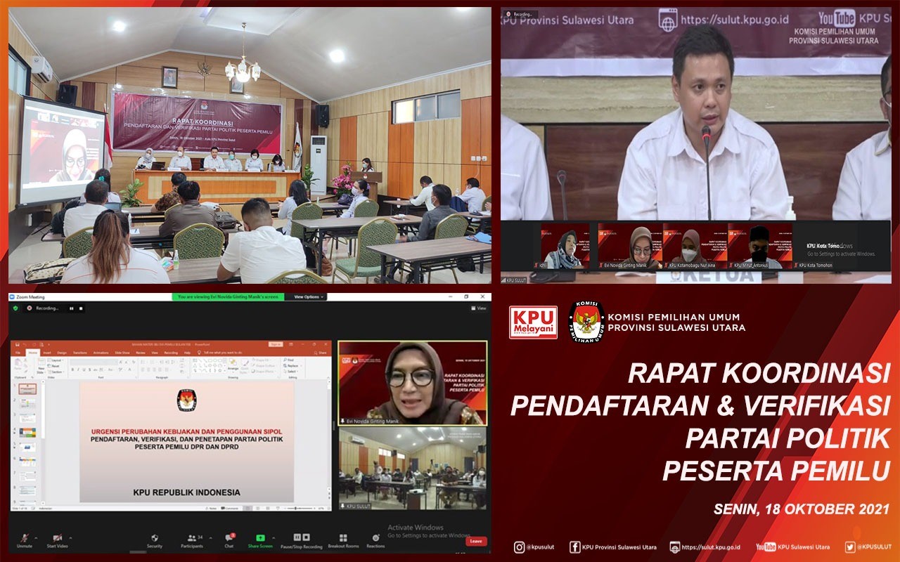 Manado - sulut.kpu.go.id, Melalui Luring dan Daring, KPU Provinsi Sulawesi Utara menyelenggarakan Rapat Koordinasi dengan fokus bahasan tentang Pendaftaran dan Verifikasi Partai Politik Peserta Pemilu. Kegiatan yang dilaksanakan Senin, 18 Oktober 2021 dibuka oleh DR. Ardiles M.R. Mewoh, S.IP., M.Si. selaku Ketua KPU Provinsi Sulawesi Utara. Di hadapan peserta Rapat yaitu Divisi Teknis Penyelenggaraan, Kepala Sub bagian Teknis dan Hupmas KPU Kabupaten dan Kota, Para Pimpinan Partai Politik Tingkat Provinsi, Bapak Ardiles Mewoh mengungkapkan pentingnya mengevaluasi proses pendaftaran dan verifikasi partai politik peserta pemilu. Evaluasi ini sebagai sarana bagi KPU secara kelembagaan untuk meningkatkan profesionalitas layanan. Setelah pembukaan dan arahan, peserta rapat mendengarkan arahan langsung oleh Komisioner KPU RI Ibu Evi Novida Ginting selaku Ketua Divisi Teknis Penyelenggaraan. Melalui zoom meeting, Bu Evi menyampaikan materinya tentang Urgensi Perubahan Kebijakan Dan Penggunaan SIPOL Pendaftaran, Verifikasi, Penetapan Partai Politik Peserta Pemilu Anggota DPR dan DPRD. Perubahan kebijakan yang dimaksud Bu Evi terangkum dalam lima tabel. Pertama kebijakan yang Mudah; kedua kebijakan yang Murah; ketiga kebijakan yang Mepat; keempat kebijakan yang Transparan; kelima, kebijakan yang Akuntabel. Sebagai contoh kebijakan yang dinilai mudah yaitu adanya tahapan Persiapan pendaftaran. Partai politik diberi tenggat waktu selama 120 hari untuk menginput data ke dalam SIPOL. KPU menerapkan kebijakan pendaftaran bersifat sentralistik yaitu Partai Politik menyampaikan data data dan dokumen ke KPU-RI. KPU juga menggunakan pemanfaatan teknologi sebagai alat kerja utama dalam hal ini SIPOL (Sistem Informasi Partai Politik). Selesai sesi pemaparan materi dilanjutkan tanya jawab yang dipandu oleh Ibu Yessy Momongan selaku Ketua Divisi Teknis Penyelenggaraan KPU Provinsi Sulawesi Utara. Rapat Koordinasi yang berlangsung dari jam 2 siang sampai kurang lebih jam 8 malam, berhasil menyusun Daftar Infentarisasi Masalah terkait Pendaftaran dan Verifikasi Partai Politik. Rapat ditutup oleh Ketua Ardiles dengan menyampaikan beberapa point penutupnya. Dintaranya adalah terkait kebijakan yang sedang diusahakan oleh KPU-RI tentunya masih dalam proses. Hal ini masih perlu persetujuan dari pemangku kepentingan lainnya sampai pada satu produk aturan yang ditetapkan.