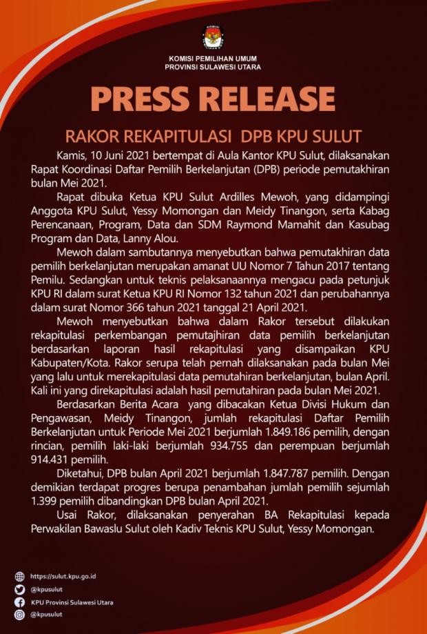 Manado, 30 Juni 2021, sulut.kpu.go.id - Rapat Koordinasi Daring Divisi Teknis KPU Provinsi dengan KPU Kab/Kota se-Sulut membahas rencana kegiatan diskusi. Sesuai Surat Undangan Ketua KPU Prov. Sulut Nomor: 253/PY.02.2-Und/71/Prov/VI/2021 tanggal 28 Juni 2021 diundang Ketua Divisi Teknis, Kasub Bag Teknis dan Hupmas, serta staf di bagian teknis dari setiap KPU Kab/Kota untuk melaksanakan Rakord Daring. Rakord dilaksanakan hari Rabu, 30 Juni 2021 pukul 10:00 WITA dibuka oleh Ketua Divisi Teknis Penyelenggaraan KPU Prov. Sulut Ibu Yessy Y. Momongan, S.Th., M.Si. Dalam sambutan sekaligus arahannya, Kadiv Teknis menegaskan bahwa maksud Rakord dilaksanakan untuk membahasa persiapan diskusi internal dengan 7 tema penting yaitu: Daerah Pemilihan (Dapil) Verifikasi Parpol (Verpol) Verifikasi Perseorangan Dana Kampanye Pencalonan Pungut Hitung dan Rekap Penetapan Calon. Lebih lanjut Bu Yessy Momongan mengatakan “ 7 tema ini merupakan isu penting dalam setiap tahapan Pemilu terutama kita penyelenggara pemilu yang bertugas di divisi teknis penyelenggaraan. Untuk itu kita harus menguasai dengan baik materi-materi ini. Kegiatan diskusi internal juga dimaksud sebagai salah satu kegiatan untuk meningkatkan kapasitas diri sebagai penyelenggara.” Menurutnya setiap penyelenggara perlu meningkatkan kapasitas dan integritasnya. Dalam 7 isu penting ini setiap orang dapat melihat juga integritasnya selama ini. Kadiv Yessy Momongan mencontohkan ada kasus dalam penentuan Dapil, integritas diuji untuk tidak tunduk pada godaan-godaan yang dapat menguntungkan atau merugikan salah satu atau beberapa peserta Pemilu. Dalam sesi tanya jawab muncul tanggapan dari KPU kab/Kota diantaranya dari KPU Kota Bitung, KPU Kab. Kepulauan Sangihe, KPU Kab. Kepulauan Sitaro dan KPU Kab. Mitra. Mereka menyatakan kesiapannya dalam kegiatan yang akan berlangsung ke depan ini. Lebih lanjut juga KPU Kab/Kota mengusulkan dalam beberapa hari ke depan sudah ditetapkan jadwal dan mekanismenya supaya semua bisa mempersiapkan diri sedini mungkin. Rakord yang diikuti oleh 15 KPU Kab/Kota ditutup oleh Ketua KPU Prov. Sulut Dr. Ardiles M.R. Mewoh, S.IP., M.Si. Dalam sambutannya, Ketua Ardiles mengapresiasi rencana Divisi Teknis untuk menyelenggarakan kegiatan diskusi internal ini. Menurutnya, peningkatan kapasitas diri sebagai penyelenggara harus dilakukan dengan berbagai cara. Salah satunya diskusi-diskusi seperti yang sedang direncanakan ini. Lanjutnya, meskipun tidak sedang dalam tahapan Pemilu, saat ini kesempatan untuk melakukan inovasi-inovasi yang dapat menambah kapasitas dan keterampilan kita sebagai penyelenggara. Tak lupa Pak Ardiles juga mengingatkan untuk tetap disiplin melaksanakan tugas di kantor sesuai mekanisme yang berlaku. Dalam setiap Rakord Daring, KPU Provinsi meminta KPU Kab/Kota untuk daring dari kantor masing-masing. Bahkan dianjurkan dalam satu frame camera yang sama dari ruang rapat masing-masing. Kebijakan ini diambil sebagai salah satu cara KPU Provinsi berkoordinasi secara berjenjang dalam kesatuan lembaga. Akhirnya Ketua KPU Sulut menutup kegiatan rakord secara resmi sambil berpesan untuk tetap menjaga kesehatan dan penerapan protokol kesehatan pencegahan Covid-19. (910)
