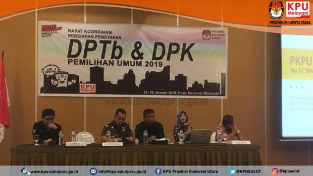 Rapat Koordinasi Persiapan Penetapan DPTb dan DPK Provinsi Sulawesi Utara Pada Pemilu 2019 dengan Unsur Instansi terkait ini dilaksanakan selama 3 hari dari tanggal 24 s.d 26 Januari 2019. (admin/evans)