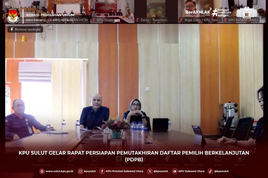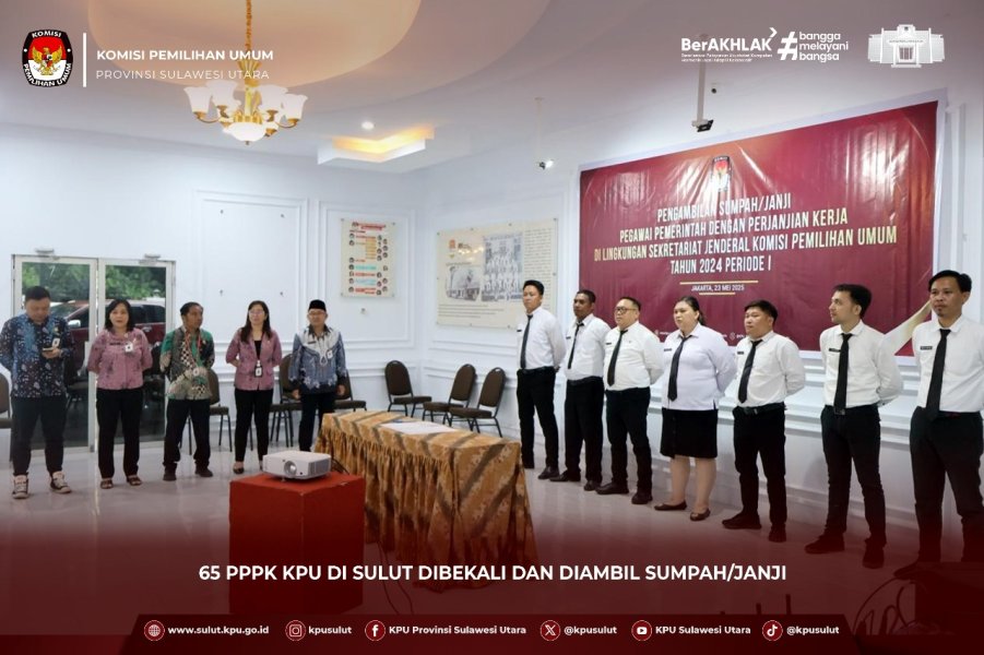 Manado. sulut.kpu.go.id – Sebanyak 65 Pegawai Pemerintah dengan Perjanjian Kerja (PPPK) di Lingkungan Sekretariat Jenderal KPU Tahun Anggaran 2024 Periode I yang ditugaskan di KPU Provinsi dan KPU Kabupaen/Kota se-Sulut mengikuti Pembekalan dan Pengambilan Sumpah/Janji secara daring, jumat (23/5). Kepala Biro SDM Setjen KPU, Yuli Hertati, didampingi Pejabat Eselon III Biro SDM membuka kegiatan ini pukul 08.00 Wib. Dalam sambutannya Hertati terlebih dahulu mengucapkan selamat kepada PPPK yang baru saja terangkat, hal ini patut disyukuri karena kuota PPPK yang terangkat tahun ini lebih banyak dari tahun sebelumnya untuk itu sudah menjadi kewajiban kita untuk mengetahui dan mematuhi aturan-aturan terkait ASN yang sebentar lagi akan dipaparkan oleh narasumber yang dihadirkan. Kegiatan diawali dengan pembekalan berupa penyampaian materi dari Karo SDM BKN dan Pejabat Struktural Biro SDM Setjen KPU. Pada kesempatan ini juga PPPK dibekali dengan materi terkait peraturan perundang-undangan ASN, Hak dan Kewajibannya serta Disiplin ASN. Dari 65 PPK di 16 satker, 7 PPPK di KPU Provinsi Sulut mengikuti Pengambilan Sumpah/Janji di dampingi Sekretaris KPU Provinsi Sulut, Meidy Malonda serta Pejabat Struktural Eelon III dan Eselon IV di Media Center KPU Sulut. Sekretaris Jenderal KPU, Bernard Dermawan Sutrisno memimpin pengambilan Sumpah/Janji 3486 PPPK Sekretariat Jenderal KPU. Pada kesempatan ini, Bernad menghimbau agar seluruh PPPK yang diambil sumpah/janji kembali melaksanakan tugasnya sesuai dengan jabatan sebelumnya sebagai PPNPN. Bernad juga menekankan agar aturan-aturan yang melekat kepada ASN agar ditaati bersama karena hari ini seluruh PPPK yang dilantik telah resmi diangkat sebagai ASN. Selanjutnya ia berharap agar kedepannnya semua PPPK dapat meningkatkan kinerjanya di satuan kerja masing-masing karena pasca penyelenggaraan Pemilu dan Pilkada banyak tugas-tugas yang harus diselesaikan.