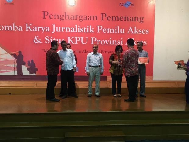 Jakarta, sulut.kpu.go.id – Bertempat di Ruang Rapat Lantai 2 Komisi Pemilihan Umum (KPU) RI bekerjasama dengan General Election Network for Disability Access (AGENDA) dan Dewan Pers mengumumkan para pemenang lomba karya jurnalistik pemilu akses dan situs KPU provinsi akses, Jumat (31/3). Lomba yang dimulai sejak 23 September 2016 tersebut diikuti oleh 202 karya jurnalistik dari seluruh daerah di Indonesia yang terdiri dari 97 karya pemberitaan di media cetak/online; 36 karya penulisan opini; 55 karya foto pemilu akses; serta 14 karya pemberitaan di media TV/radio. Selain memberikan penghargaan pada kategori lomba tersebut, AGENDA secara khusus memberikan apresiasi dan penghargaan bagi situs KPU provinsi yang akses bagi penyandang disabilitas. Berikut merupakan daftar pemenang dari masing-masing kategori lomba, serta situs KPU provinsi akses. Komisi Pemilihan Umum (KPU) Provinsi Sulawesi Utara sendiri memperoleh penghargaan dengan Kategori Situs KPU Provinsi Akses. Yessy Momongan selaku Ketua KPU Provinsi Sulawesi Utara mewakili dalam rangka penerimaan penghargaan ini. Kedepan harapan Yessy bahwa pengelolaan Situs KPU Provinsi Sulawesi dapat lebih ditingkatkan lagi untuk memberikan kemudahan informasi kepada seluruh masyarakat. Selain itu Ketua KPU Provinsi Sulawesi yang saat ini merupakan Calon Komisioner Komisi Pemilihan Umum (KPU) RI periode 2017 - 2022 berharap KPU Provinsi Sulawesi Utara dapat memperoleh penghargaan yang sama untuk tahun berikutnya. Situs KPU Provinsi Akses: Juara I – Situs KPU Provinsi Banten; Juara II – Situs KPU Provinsi Sulawesi Utara; Juara III – Situs KPU Provinsi Kalimantan Tengah. Kategori Pemberitaan di Media Cetak/Online: Juara I – Antony Lee dan Agnes Theodora (Kompas), dengan judul Sulitnya Menjaga Hak Difabel Psikososial; Juara II – Adi Warsidi (Tempo.com), dengan judul Pengalaman Mencoblos Pemilih Difabel Saat Pilkada Aceh; Juara III – Muhammad Hafil (Republika), dengan judul Catatan Pilkada dari Kursi Roda. Kategori Penulisan Opini di Media: Juara I – Nurul Amalia Salabi (Rumahpemilu.org), dengan judul Pemilu Akses Menagih Janji Konstitusi; Juara II – Harjoni Desky (Pewarta-Indonesia.com), dengan judul Penyandang Disabilitas Adalah Kita (Upaya Peningkatan Partisipasi Politik Penyandang Disabilitas); Juara III – Andrian Habibi, (Indonesiana.tempo.com), dengan judul Pemenuhan Hak Pemilih Disabilitas. Kategori Foto Pemilu Akses: Juara I – Maman Sukirman (Koran Sindo), dengan judul Disabilitas Salurkan Hak Suara-Pilkada Takalar 2017; Juara II – Alfi Yusron (Majalah Derap Desa), dengan judul Partisipasi Kaki Kiri Sang Tuna Daksa Untuk Pemilukada; Juara III – Yulianto (Koran Sindo) dengan judul 1,5 Juta Penduduk Terancam Tidak Masuk DPT. Kategori Pemberitaan di Media Elektronk (TV/Radio): Juara I – Nova Misdayanti Mandasari (Kompas TV Aceh), dengan judul Tuna Daksa Korban Konflik Menentukan Pemimpinnya; Juara II – Program 360 Metro TV, dengan judul Pilkada Setara; Juara III – Fabianus Benge (INews TV Kupang), dengan judul Pemilih Disabilitas Minta KPUD Siapkan Template. (admin/evans/kpusulut) Sumber : kpu.go.id