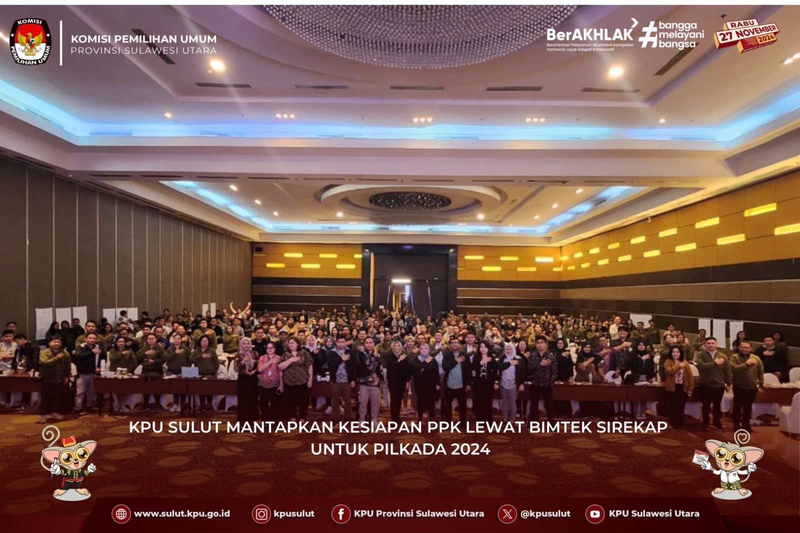 Manado, sulut.kpu.go.id Komisi Pemilihan Umum (KPU) Provinsi Sulawesi Utara melaksanakan Bimbingan Teknis dan Simulasi Penggunaan Aplikasi Sirekap untuk Panitia Pemilihan Kecamatan (PPK) Pemilihan Kepala Daerah tahun 2024 berlangsung di Novotel Manado Golf Resort & Convention Center pada 10 – 12 Oktober 2024.