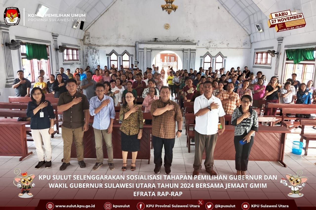 Manado, sulut.kpu.go.id- KPU Sulut menyelenggarakan kegiatan sosialisasi tahapan pemilihan Gubernur dan Wakil Gubernur Sulawesi Utara tahun 2024 bersama Jemaat GMIM Efrata Rap-Rap. Kegiatan ini mengusung tema "MENUJU PILKADA DAMAI" dan bertempat di GMIM Efrata Rap-Rap, selasa(6/8/2024). Mewakili KPU Sulut Ketua KPU Minahasa Selatan, Tomy Moga membuka secara resmi kegiatan. Dalam sambutannya, Tomy menekankan gereja juga dapat memainkan peran penting dalam mengedukasi jemaatnya tentang proses demokrasi yang sedang kita jalani. Gereja sebagai lembaga yang dekat dengan masyarakat memiliki potensi besar untuk menyampaikan informasi yang benar dan akurat mengenai tahapan Pilkada. Dengan pemahaman yang baik, masyarakat dapat berpartisipasi aktif dalam Pilkada," ujar Tomy. Lebih lanjut, Tomy menegaskan bahwa tujuan akhir dari edukasi ini adalah tercapainya Pilkada yang aman dan damai. "Salah satu indikator keberhasilan Pilkada adalah meningkatnya partisipasi pemilih dan terciptanya kondisi yang aman dan damai. Kami berharap melalui sosialisasi ini, masyarakat semakin sadar akan pentingnya menggunakan hak pilih mereka dengan bijak dan turut serta menjaga keamanan selama proses Pilkada berlangsung," tambahnya. Kegiatan ini merupakan hasil kerja sama antara KPU Sulut dan Jemaat GMIM Efrata Rap-Rap dengan tujuan memberikan pengetahuan serta pemahaman kepada warga GMIM tentang tahapan Pilkada 2024 di wilayah Sulawesi Utara. Kegiatan ini juga menghadirkan tiga narasumber, Tomy Moga Ketua KPU Minahasa Selatan, membawakan materi tentang Tahapan Pilkada 2024, Pdt. Welly Pudihang, dengan materi tentang Peran Gereja dalam Terselenggaranya Pilkada Serentak Tahun 2024 dan Jerry Sumampouw Akademisi, dengan materi tentang Menuju Pilkada Damai. Dengan adanya kegiatan ini, diharapkan masyarakat dapat lebih memahami tahapan-tahapan Pilkada serta ikut berpartisipasi aktif dalam mewujudkan Pilkada yang damai di Sulawesi Utara.