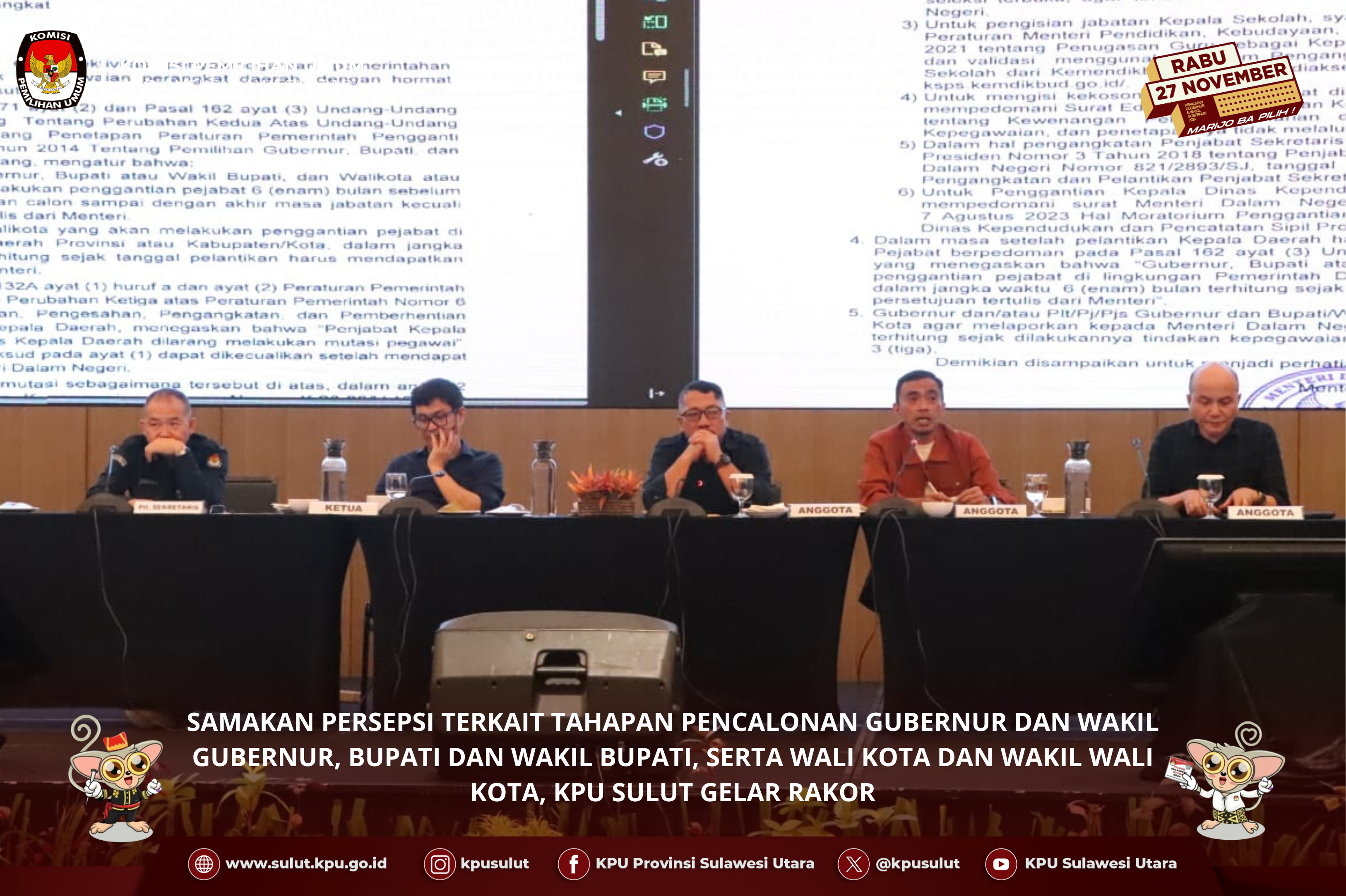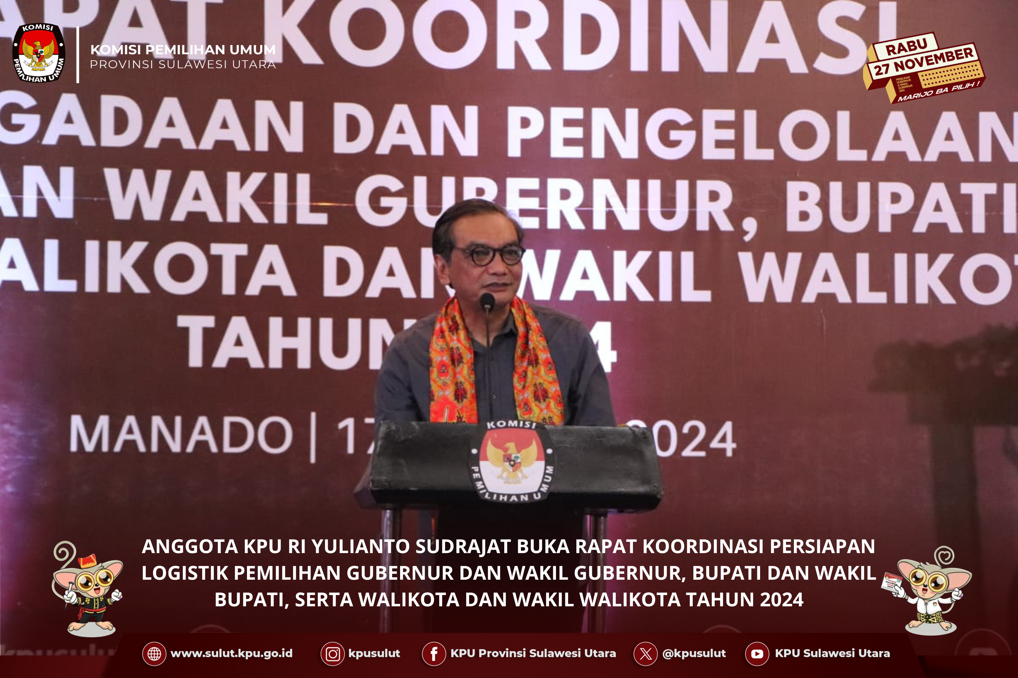 Anggota KPU RI Yulianto Sudrajat Buka Rapat Koordinasi Persiapan Logistik Pemilihan Gubernur dan Wakil Gubernur, Bupati dan Wakil Bupati, serta Walikota dan Wakil Walikota Tahun 2024 Manado, sulut.kpu.go.id — KPU Sulut gelar Pembukaan Kegiatan rapat koordinasi (Rakor) dalam persiapan pengadaan dan pengelolaan logistik untuk Pilkada tahun 2024 di Grand Kawanua Novotel Manado. Kegiatan ini berlangsung selama 3 hari mulai tanggal 17 Juli hingga 19 Juli 2024. Anggota KPU RI Yulianto Sudrajat berkesempatan hadir sekaligus membuka Rapat Koordinasi Persiapan Logistik Pemilihan Gubernur dan Wakil Gubernur, Bupati dan Wakil Bupati, serta Walikota dan Wakil Walikota Tahun 2024. Dalam arahannya Yulianto menegaskan perihal logistik ini jadi penentu terlaksananya Pilkada pada 27 November 2024. Karena itu, beliau menghimbau agar kedepan koordinasi antara KPU Provinsi Sulut dan KPU Kabupaten/Kota perlu diperkuat lagi. Selain itu semua peserta yang hadir pada Rakor ini wajib memperhatikan tiga aspek yakni aspek perencanaan terkait pengadaan Logistik, aspek pengadaan dan pendistribusiannya, sehingga perlu persiapan yang matang " ujarnya. Ketua KPU Sulut, Kenly Poluan juga memberikan apresiasi dan berterima kasih atas kehadiran Anggota KPU RI, Yulianto Sudrajat serta KPU Kabupaten/Kota. “Pertemuan ini sebagai tindak lanjut dari Rapat Koordinasi Pengelolaan Logistik yang diselenggarakan KPU RI beberapa waktu yang lalu,oleh karenanya dalam kegiatan ini kita akan membahas teknis serta pembinaannya, jadi saya berharap peserta yang hadir dapat mengikuti kegiatan dengan baik ” ujar Poluan. Rakor ini dihadiri oleh 150 orang peserta yang terdiri dari Ketua dan Anggota, Sekretaris, Kasubag Keuangan Umum dan Logistik ,PPK, PPBJ dan Operator Silog KPU se-Sulawesi Utara serta mengundang beberapa narasumber yaitu Edmond N. Purba, Koordinator Bidang Intelejen Kejati Sulut; Lidya R. E. Sondakh, Kepala Sub Bidang APBD dari BKAD Sulut; Mugi Sekar Jaya, Kepala Biro Operasi Polda Sulut; dan Ardiles Mewoh, Ketua Bawaslu Sulut. Kegiatan kemudian dilanjutkan dengan diskusi dan tanya jawab antara peserta, yang memperkaya pemahaman akan berbagai permasalahan yang mungkin timbul selama proses pengadaan dan pengelolaan logistik Pilkada. Diharapkan, hasil dari Rakor ini akan menjadi landasan kuat untuk implementasi yang efektif dan efisien dalam menjalankan Pilkada tahun 2024.(Ika/Ed:NR Foto by Wale Pemilu).