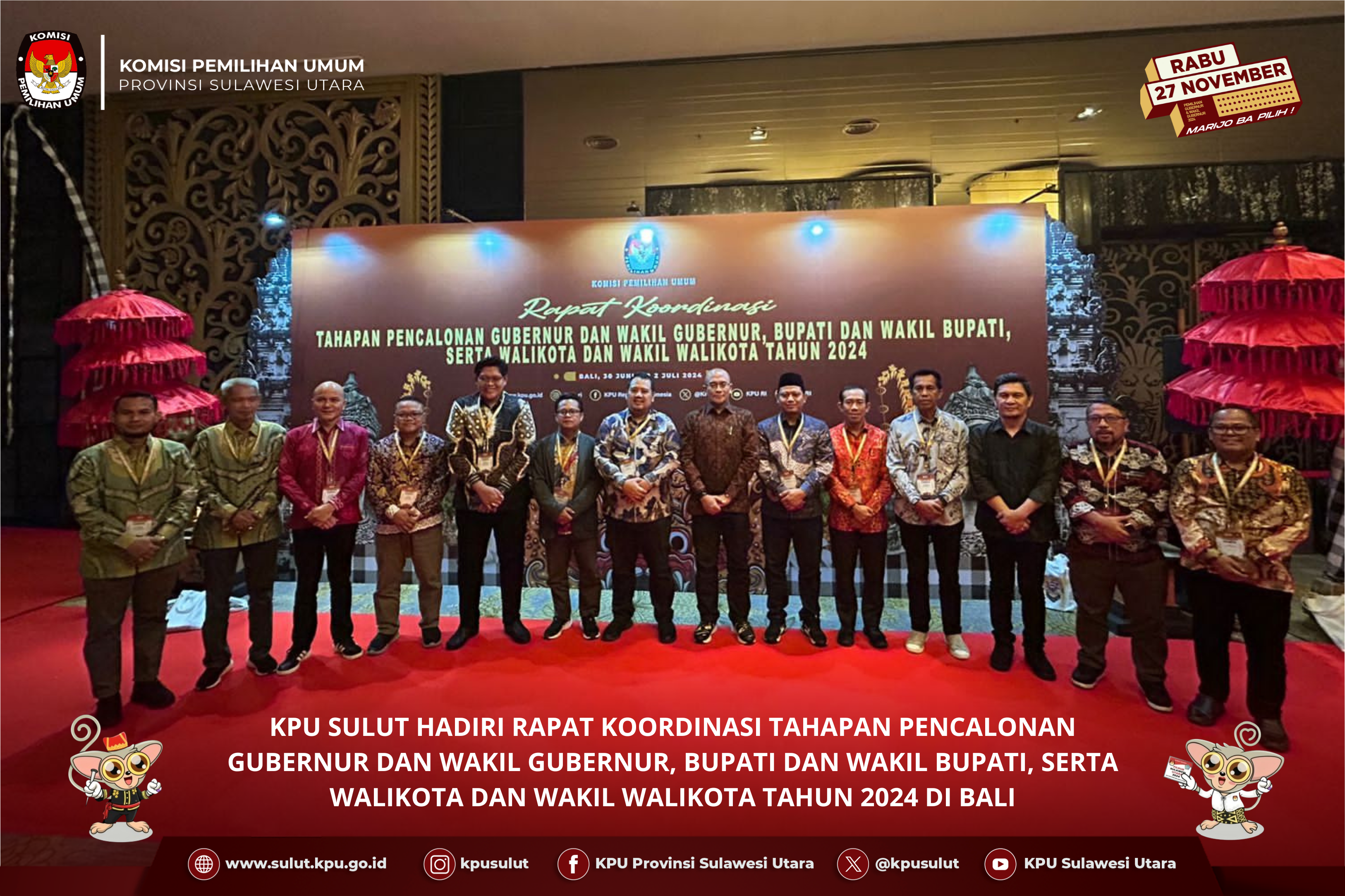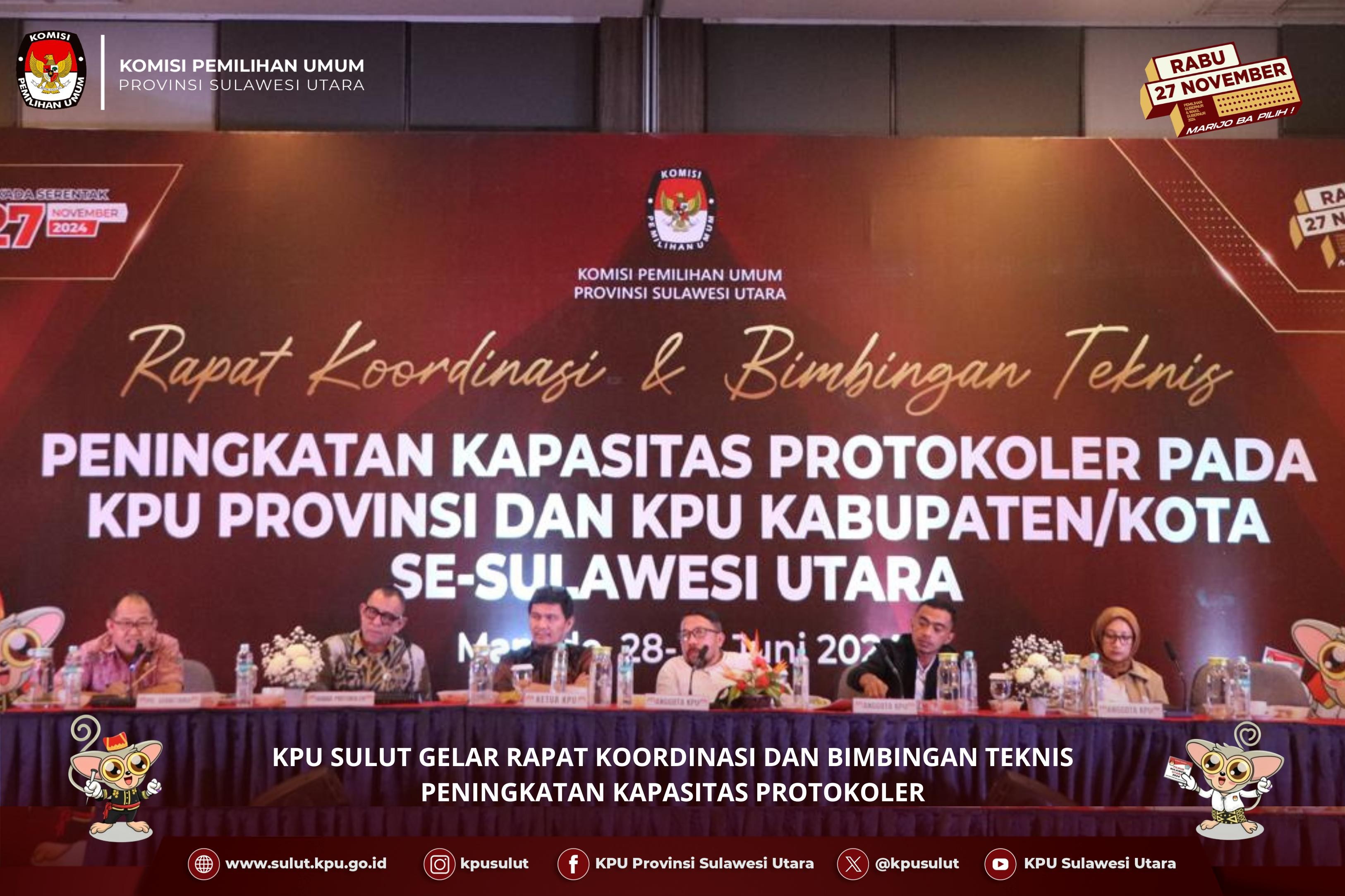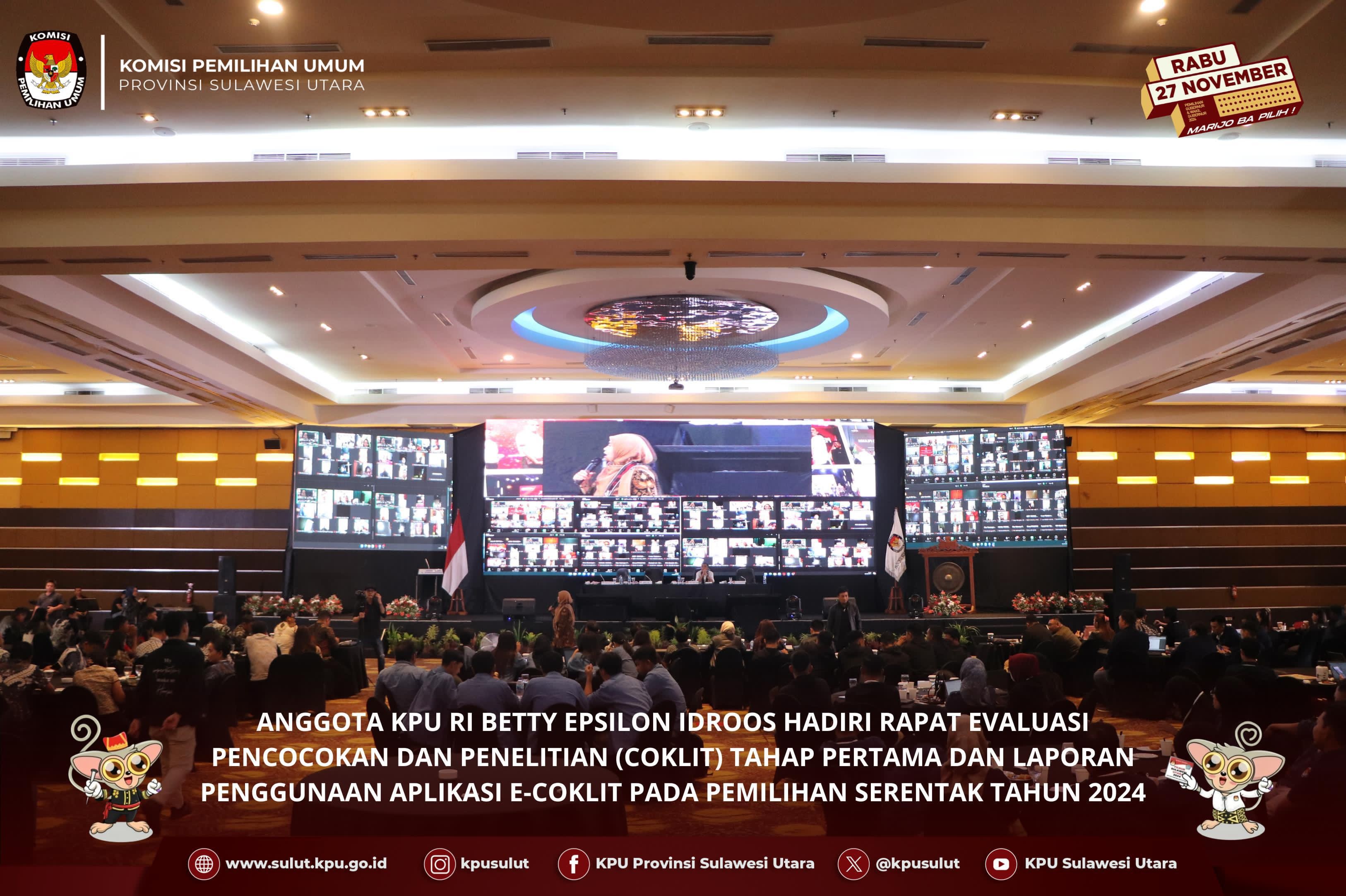 Manado, kpusulut.go.id - KPU Sulut menggelar Rapat Evaluasi Pencocokan dan Penelitian (Coklit) Tahap Pertama Serta Laporan Penggunaan Aplikasi E-Coklit Dalam Persiapan Pemilihan Serentak Tahun 2024. Acara ini berlangsung di Hotel Grand Kawanua Novotel, Manado, mulai tanggal 2 hingga 4 Juli 2024. Tujuan utama dari rapat ini adalah untuk mengevaluasi kelancaran dan tantangan yang dihadapi dalam tahap pertama Coklit, yang merupakan proses penting dalam memastikan data kependudukan yang akan digunakan dalam Pemilihan Serentak tanggal 27 november mendatang. Anggota KPU Sulut Awaluddin Umbola dalam pembukaan kegiatan menyampaikan “saat ini sudah memasuki tahap pertama coklit dan KPU Sulut telah membentuk badan ad hoc, dengan menetapkan 885 anggota PPK, Anggota PPS 4.390 dan untuk petugas Pantarlih sendiri berjumlah 7598 orang yang tersebar di 4390 TPS, sejauh ini proses coklit dilapangan berjalan dengan lancar belum ada kendala yang menghambat, untuk itu saya berharap para peserta yang hadir bisa mengikuti kegiatan ini dengan baik agar di tenggang waktu tahapan coklit sebulan ini bisa berjalan dengan baik ”, pungkasnya. Anggota KPU RI Betty Idroos yang turut hadir memberikan arahannya terkait kegiatan pencoklitan ini. "kegiatan pencocokan dan penelitian atau biasa disebut Coklit yakni kegiatan pencocokan data pemilih dengan dokumen kependudukan pemilih yang kemudian diteliti apakah warga tersebut memenuhi syarat atau tidak. Agar mempermudah kerja Pantarlih dalam melakukan pendataan disediakanlah e-Coklit, “tak lupa saya sangat mengapresiasi atas kerja keras dari teman-teman KPU Kabupaten/Kota, PPK, TPS dan KPPS serta teman-teman petugas pantarlih sebagai ujung tombak. Rapat Evaluasi ini turut dihadiri oleh Anggota KPU Sulut Lanny Ointu, Sekretariat KPU Sulut, dan badan adhoc yang terlibat langsung dalam proses Coklit. Ada pula yang mengikuti proses ini melalui daring via aplikasi zoom meeting.(Ika/Ed:NR Foto by Wale Pemilu)