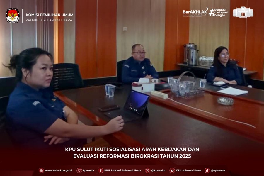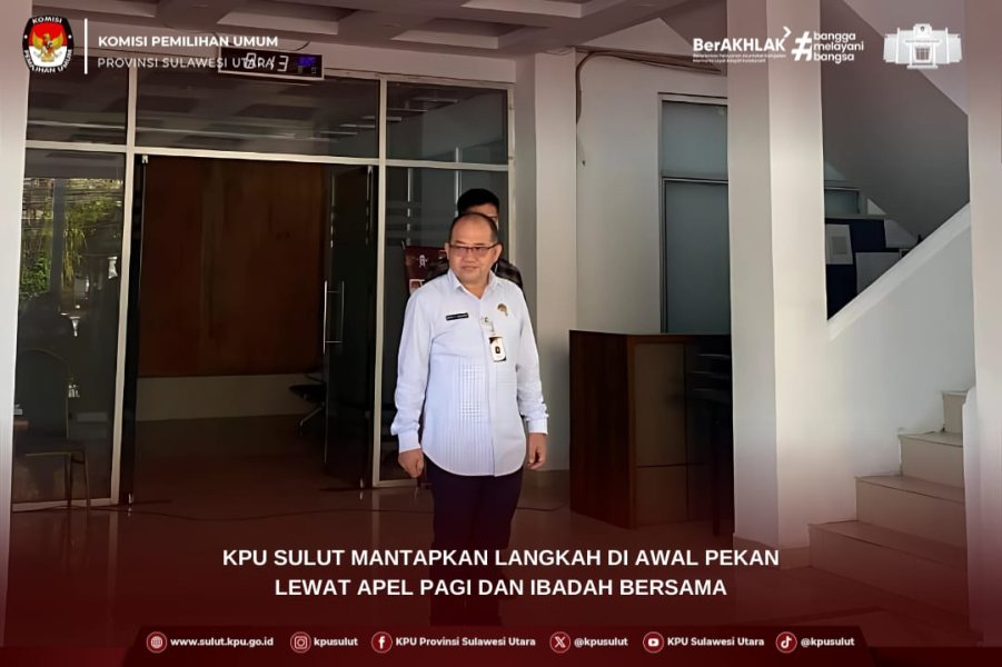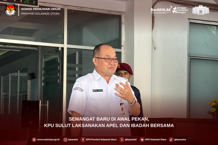 Manado, sulut.kpu.go.id – KPU Sulut melaksanakan apel pagi dan ibadah rutin pukul 08.00 Wita yang diikuti oleh seluruh jajaran KPU Sulut. Sekretaris KPU Sulut, Meidy Malonda bertindak selaku Pembina Apel yang berlangsung di halaman kantor KPU Sulut, senin(8/9). Dalam arahannya, Meidy Malonda menekankan pentingnya disiplin kerja, profesionalitas dan integritas dalam bekerja. Ia mengingatkan seluruh jajaran KPU Sulut untuk selalu menjaga komitmen serta mengedepankan kualitas kinerja. “Disiplin kerja merupakan wujud tanggung jawab dan komitmen bersama dalam bekerja yang berjalan seiring dengan integritas. Dengan begitu, kita dapat memberikan hasil kerja yang maksimal, terpercaya, serta membawa manfaat bagi lembaga maupun masyarakat,” ujar Malonda. Lebih lanjut, ia juga menegaskan pentingnya membangun kerja sama yang solid serta kolaborasi antarbagian di lingkungan KPU Sulut. Hal ini dinilainya akan memperkuat kualitas kerja organisasi secara menyeluruh. Usai pelaksanaan apel, kegiatan dilanjutkan dengan ibadah rutin bagi yang beragama kristen di Media Center KPU Sulut yang dipimpin oleh Kepala Sub Bagian Perencanaan Data Vanda Surentu. Ibadah ini menjadi wadah untuk memperkuat spiritualitas, kebersamaan, dan menumbuhkan semangat dalam menjalankan tugas.
