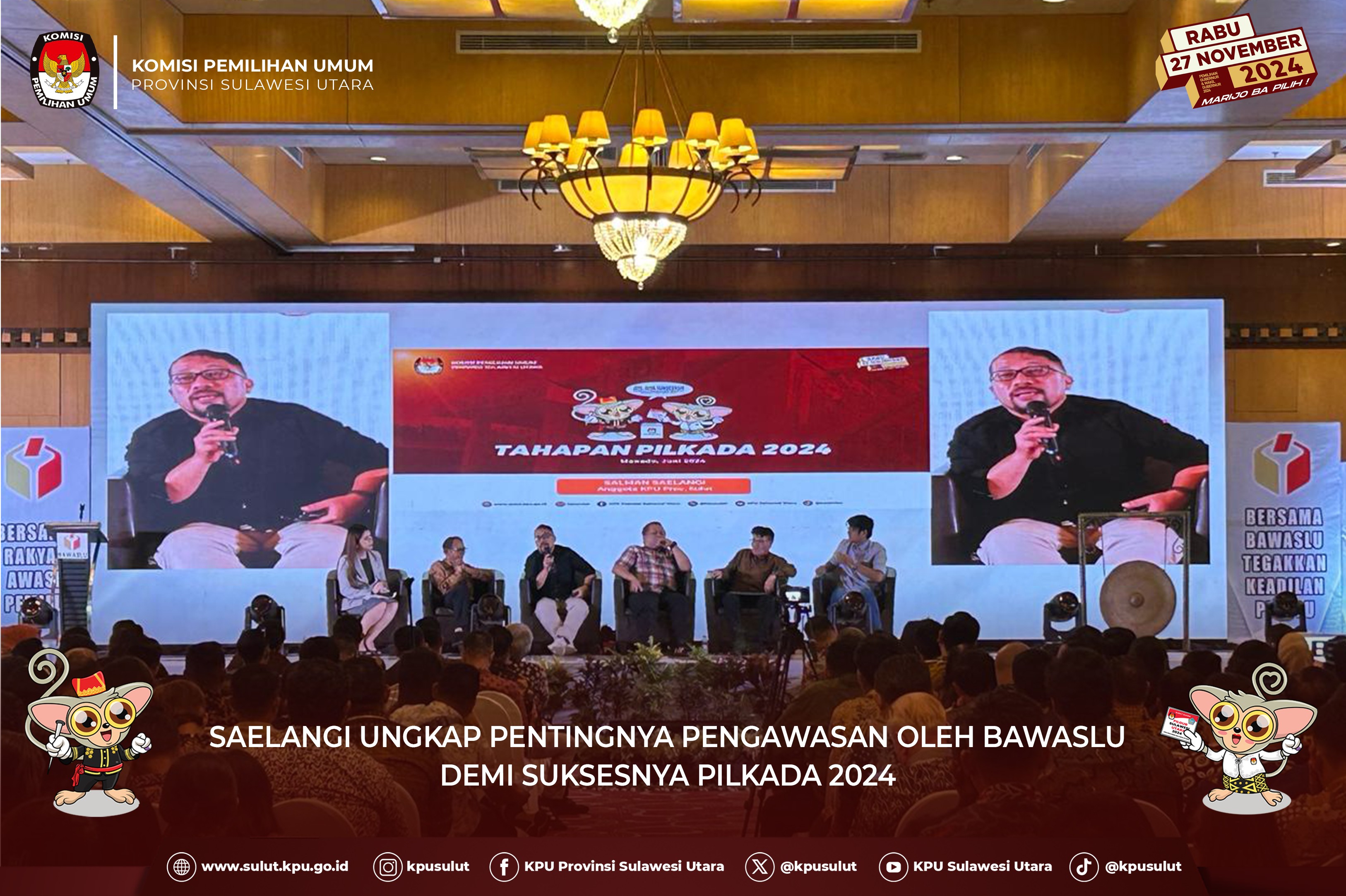 Sekretaris Pemerintah Provinsi Sulut Steve Kepel mewakili Gubernur Sulut dalam pembukaan kegiatan menekankan kehadiran kita semua saat ini, adalah wujud konsistensi tekad untuk bersama-sama mewujudkan Pilkada yang demokratis, aman dan damai di masa mendatang, untuk itu ada beberapa hal penting yang perlu menjadi perhatian yang pertama untuk memperkuat konsolidasi dan koordinasi antar seluruh pemangku kepentingan selain itu Pendidikan pemilih menjadi faktor krusial dalam meningkatkan partisipasi dan kualitas pemilih, saya juga mengajak aparat keamanan, baik TNI maupun Polri untuk bersinergi menjaga kondusivitas wilayah, mengantisipasi potensi ancaman baik dari dalam maupun dari luar, tak kalah pentingnya saya mengingatkan kepada selurun ASN untuk menjaga profesionalisme dan netralitasnya dalam setiap tahapan Pilkada kemudian yang terakhir perlu Pengawasan dan Penegakan Hukum