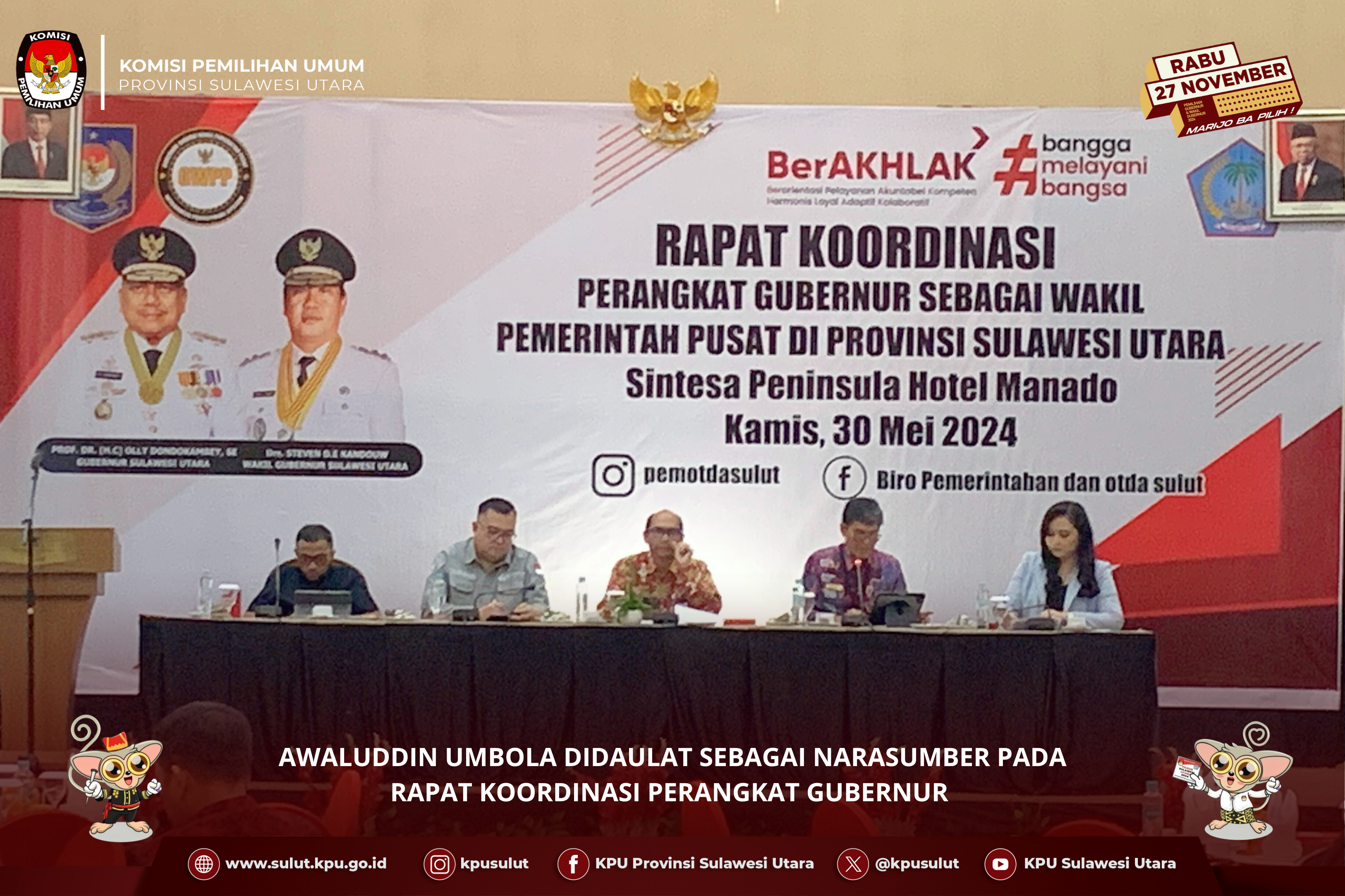Manado, sulut.kpu.go.id –Anggota KPU Sulut Awaluddin Umbola menjadi salah satu narasumber dalam Rapat Koordinasi yang diselenggarakan oleh perangkat gubernur sebagai wakil pemerintah pusat di Provinsi Sulawesi Utara, bertempat di Sintesa Peninsula Hotel Manado pada hari kamis( 30/5/2024). Rapat Koordinasi ini menjadi forum diskusi antara perangkat Gubernur, Anggota KPU, dan berbagai pihak terkait lainnya untuk mengatasi potensi hambatan atau tantangan yang mungkin muncul selama proses Pemilihan Kepala Daerah (Pilkada) 2024. Pada Pemaparannya Umbola memberikan wawasan yang penting tentang berbagai tahapan yang harus dilalui dalam proses Pilkada 2024 .Umbola juga menjelaskan ” bahwa sekarang ini tahapan awal Pilkada 2024 sudah dimulai dengan telah dilantiknya badan adhoc (PPK) di 171 kecamatan dan lebih dari 1800 desa/kelurahan di Provinsi Sulawesi Utara, sementara proses pemutakhiran serta bimbingan teknis bagi Panitia Pemungutan Suara (PPS) masih sedang berlangsung”’, ungkapnya. Selain Umbola, turut hadir juga beberapa narasumber lain yaitu Hari Utomo S.E., M.M selaku Kepala Kantor Wilayah Ditjen Perbendaharaan Provinsi Sulut yang membawakan materi terkait pertumbuhan ekonomi di Sulawesi Utara, Bambang Ari Setiono selaku Kepala Kantor Perwakilan BPKP Provinsi Sulut dengan materi tentang Peranan BPKP dalam Implementasi SPIP, kemudian Erwin Sumampouw selaku Ketua Badan Pengawas Pemilu Provinsi Sulut yang menjelaskan tentang peranan bawaslu. Tidak hanya itu kegiatan kali ini juga dihadiri oleh Sekretaris Daerah (Sekda) Kota Manado Dr Micler Lakat S.H, M.H. (Ika/Ed: NR Foto by Wale Pemilu)