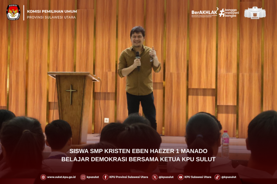 Manado, sulut.kpu.go.id – Mengusung tema “Becoming a Wise and Faithful Young Leader”, SMP Kristen Eben Haezer 1 Manado melaksanakan program Suara Demokrasi sebagai bagian dari kegiatan ekstrakurikuler sekolah. Pada kesempatan tersebut, Ketua KPU Sulut, Kenly Poluan, hadir sebagai narasumber untuk memberikan materi tentang demokrasi kepada para siswa. Kamis (21/08) Kegiatan dibuka langsung oleh Kepala Sekolah, Hopny Joki Ume, yang dalam sambutannya menyampaikan apresiasi dan terima kasih atas kehadiran Ketua KPU Sulut. Ia menegaskan bahwa materi yang disampaikan sangat mendukung program sekolah, terlebih dalam waktu dekat akan dilaksanakan pemilihan Ketua OSIS. Dalam pemaparannya, Poluan memperkenalkan kepada para pelajar mengenai arti penting demokrasi yang sehat di lingkungan sekolah. Ia menekankan bahwa setiap siswa memiliki hak suara, kesempatan untuk berpendapat, serta kewajiban untuk saling menghargai perbedaan. Poluan yang juga lulusan IKIP Manado tahun 2008 ini juga berbagi pengalaman berorganisasi semasa kuliah, di mana dirinya pernah dipercaya menjadi salah satu pemimpin ribuan mahasiswa. “Untuk menjadi seorang pemimpin yang hebat, harus mengenal demokrasi, memiliki integritas, serta kebijaksanaan dalam mengambil keputusan,” ujar Poluan. Kegiatan semakin menarik dengan adanya sesi tanya jawab dan kuis berhadiah yang dipersiapkan oleh Jajaran Sekretariat KPU Sulut bagi siswa yang aktif berpartisipasi. Antusiasme para siswa terlihat dari semangat mereka mengikuti rangkaian acara hingga selesai. Turut hadir dalam kegiatan ini para guru SMP Kristen Eben Haezer 1 Manado yang memberikan dukungan penuh terhadap program pembelajaran demokrasi bagi siswa.
