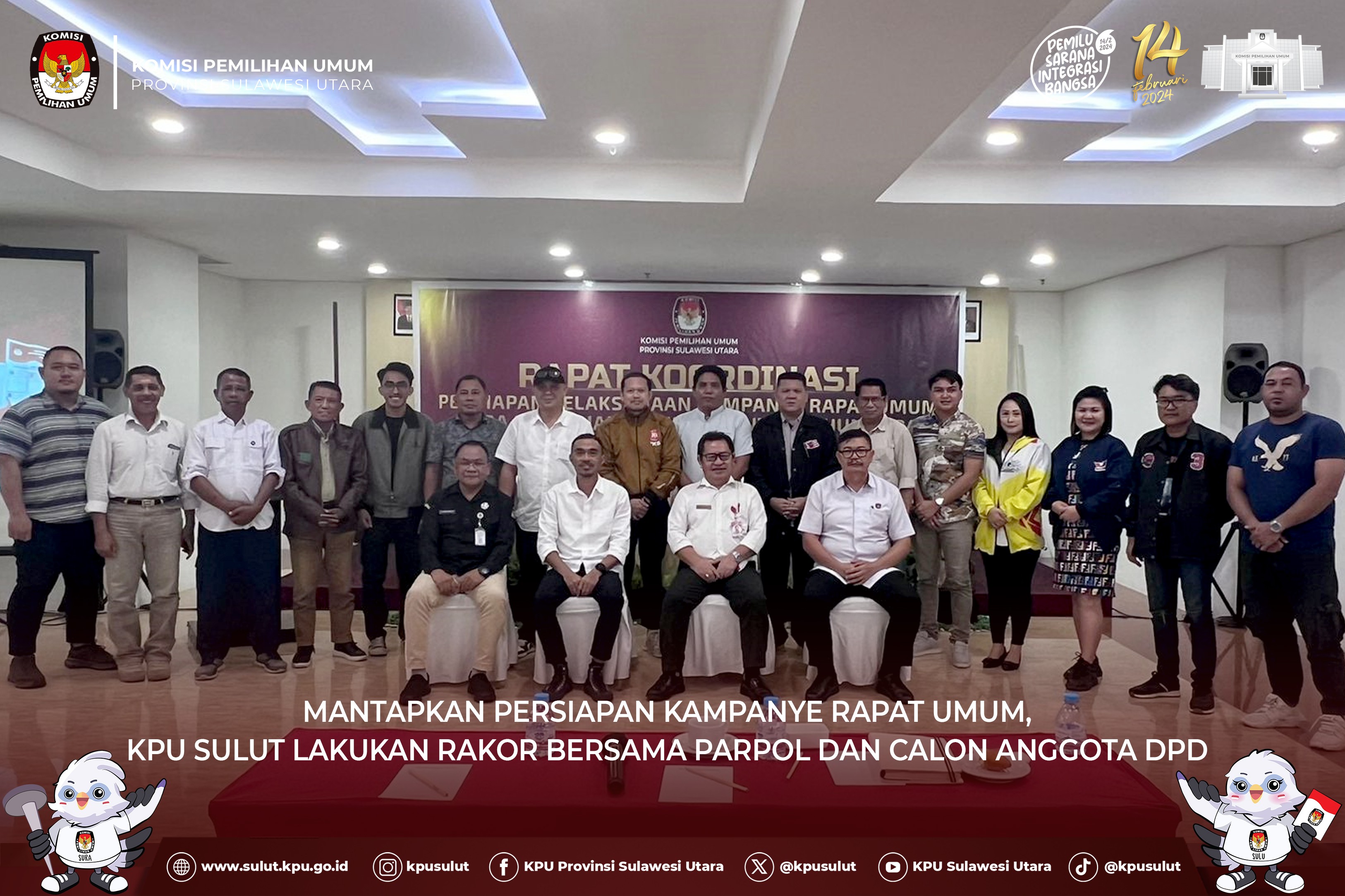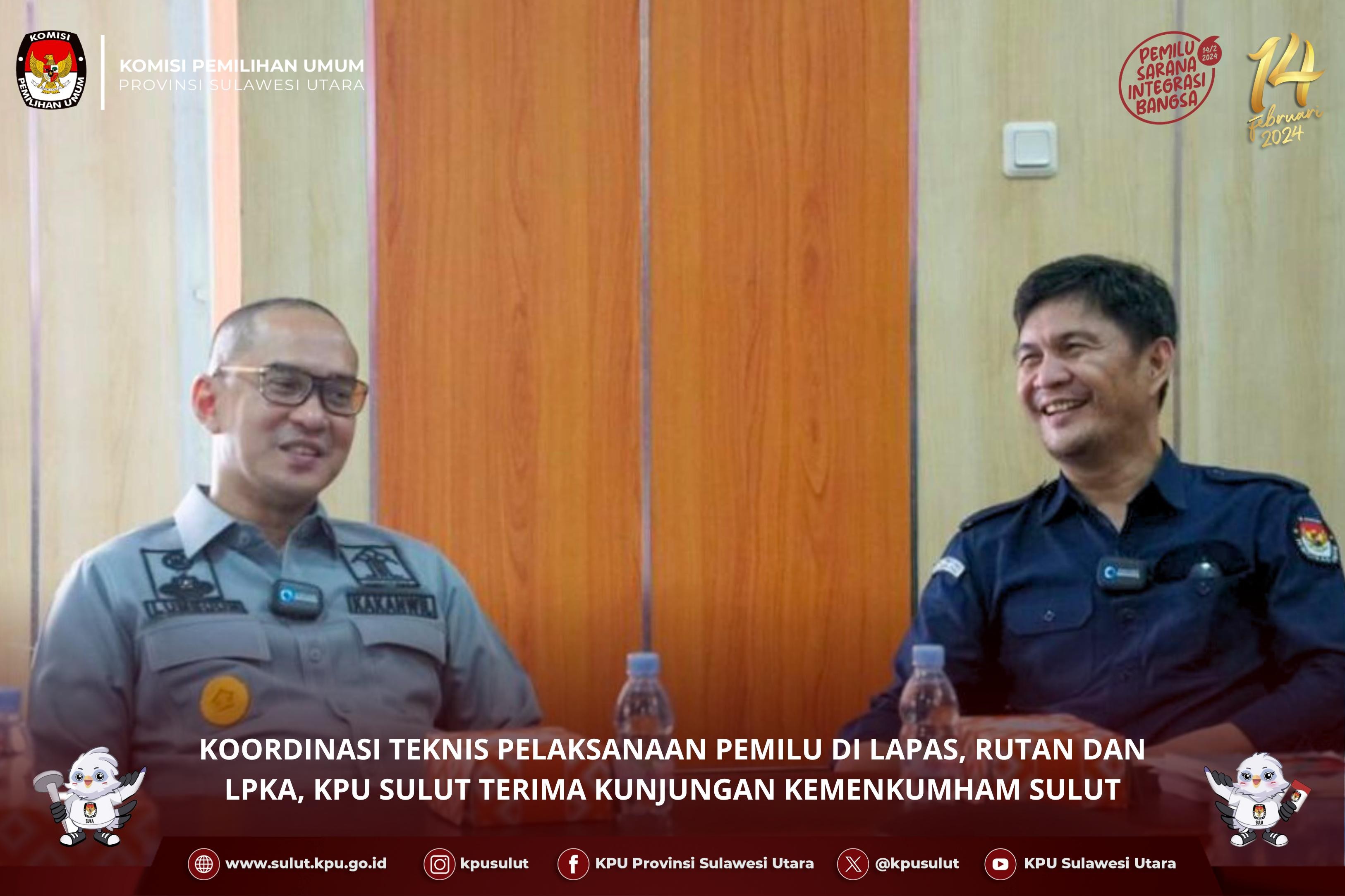Manado, sulut.kpu.go.id - Kepala Kantor Wilayah Kemenkumham Sulut Ronald Lumbuun melakukan kunjungan kelembagaan ke kantor KPU Sulut, pada hari selasa (16/01). Lumbuun menyampaikan “adapun maksud kedatangan kami kesini untuk melakukan audiensi terkait mekanisme Pelaksanaan pemilu 2024 di Lapas, Rutan dan LPKA di Jajaran Kanwil Kemenkumham Sulut menjelang Pemilihan Umum Tahun 2024 yang sebentar lagi dilaksanakan”, ungkapnya. Ketua KPU Sulut Kenly Poluan beserta Anggota Lanny Ointu menyambut langsung kedatangan Kakanwil Sulut beserta jajarannya. Dalam sambutannya Poluan mengucapkan terima kasih atas kunjungan Kakanwil Sulut beserta rombongan ke kantor KPU Sulut, selain itu besok hari kami juga akan mendatangi langsung Lapas dan Rutan Manado untuk melakukan pemetaan Pemilu 2024 sekaligus juga mengecek kondisi disana. Dikesempatan yang sama Ketua Divisi Perencanaan, Data Dan Informasi KPU Sulut Lanny Ointu menerangkan mekanisme teknis pelaksanaan Pemilu berupa Data Lokasi Khusus yang akan melakukan pemilihan pada TPS Khusus yang ada pada Lapas, Rutan dan LPKA. Turut hadir Kepala Divisi Administrasi John Batara, Kepala Divisi Pemasyarakatan Aris Munandar, Kepala Lembaga Pemasyarakatan Kelas IIA Manado Radi Setiawan serta Pejabat Struktural KPU Sulut (Ucu/Ed:NT Foto by Wale Pemilu)