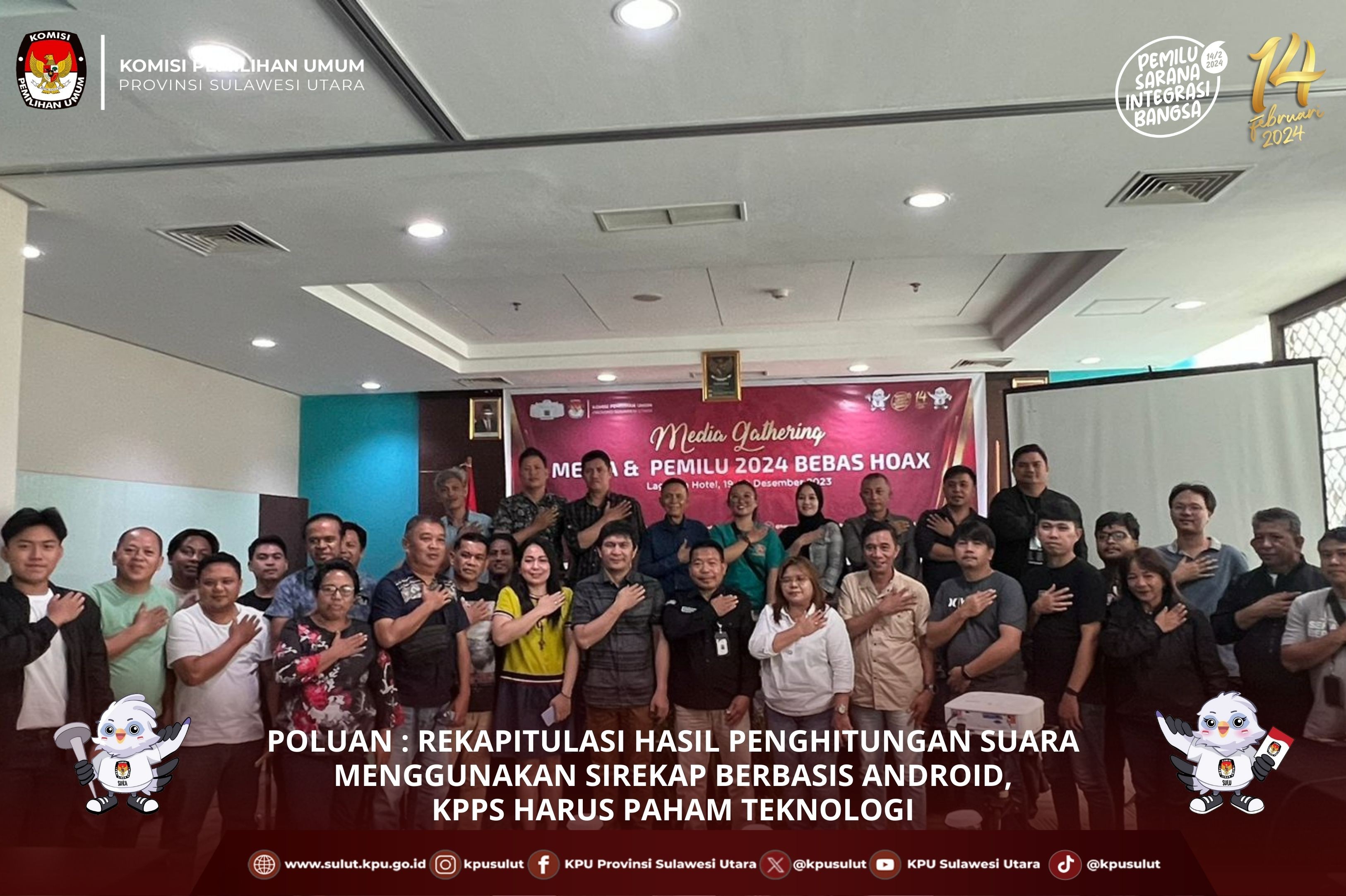 Manado, sulut.kpu.go.id –KPU Sulut kembali gelar Media Gathering bersama pewarta, kali ini Ketua KPU Sulut Paparkan Tahapan Pemilu 2024 yang sementara berlangsung yakni rekrutmen Kelompok Penyelenggara Pemungutan Suara (KPPS) di Best Western The Lagoon Hotel Manado, rabu-kamis (19-20/12/2023). Dalam pembukaan kegiatan Ketua KPU Sulut Kenly Poluan menjelaskan “saat ini KPU sementara melaksanakan rekrutmen KPPS se-Sulut oleh KPU Kabupaten dan Kota, pendaftarannya telah dimulai sejak tanggal 11 Desember 2023 hingga tanggal 21 Desember 2023, untuk itu kami membutuhkan keterlibatan media untuk turut mengawal proses rekrutmen tersebut, jika dalam prosesnya ada pelanggaran ditemui segera laporkan ke kami agar sesegera mungkin kami akan menindaklanjutinya. Saat ini kami tengah melakukan bimbingan teknis kepada PPK se-Sulut untuk memperkenalkan Sistem Informasi Rekapitulasi (Sirekap) berbasis Android terkait dengan tahapan pemungutan, perhitungan dan rekapitulasi perolehan suara, oleh karenanya untuk rekrutmen KPPS yang tengah berlangsung, diantara 7 orang calon KPPS itu, ada yang bisa paham penggunaan teknologi,’’ ungkapnya. Selain itu ‘’Sekedar informasi KPU Sulut telah menandatangani Nota Kesepakatan Hibah Daerah (NPHD) senilai 82,5 Milyar namun untuk penggunaanya kami masih menunggu ketentuan penggunaan anggaran Hibah Pilkada yang akan terbit sekitar akhir bulan ini, dimana dalam pengelolaannya kami akan melibatkan banyak pihak termaksud media sehingga kami perlu kerjasama dari rekan media semua’’, ucapnya. Turut hadir sebagai narasumber Anggota Bawaslu Sulut Erwin Sumampouw, Dosen Kepemiluan Unsrat Manado Ferry D. Liando dan Tim Pemeriksa Daerah DKPP Sulut Victory Rotty.