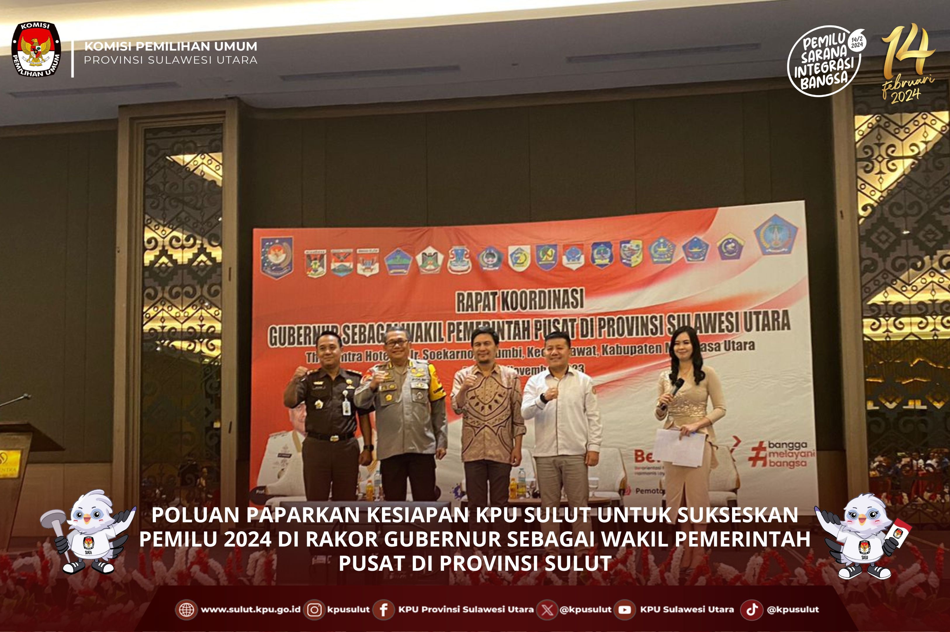 Ketua KPU Sulut memaparkan kesiapan KPU Sulut dalam menyukseskan Pemilu dan Pilkada 2024 pada Rapat Koordinasi Gubernur Sebagai Wakil Pemerintah Pusat di Provinsi Sulawesi Utara di Hotel Sentra Manado Kabupaten Minahasa Utara, (29/11). Rakor tersebut dibuka oleh Sekretaris Pemerintah Provinsi Sulut Steve H.A Kepel. Dalam sambutan, Kepel menyampaikan maksud dklaksanakan Rakor ini, untuk memaksimalkan pelaksanaan Dekonsentrasi Fungsi dan wewenang Gubernur sebagai Wakil Pemerintah Pusat dengan kinerja baik sebagaimana tercantum dalam Peraturan Menteri Dalam Negeri Nomor 12 Tahun 2018 dan kesiapan pelaksanaan Pemilu Tahun 2024 di Sulut. Ketua KPU Sulut Kenly Poluan pada kesempatan itu, menjelaskan tahapan pemilu yang sedang dilaksanakan KPU Sulut, diantaranya proses Daftar Pemilih Tambahan (DPTb), pengadaan logistik tahap kedua dan tahapan kampanye Pemilu. "Pengadaan logistik tahap kedua yaitu pengadaan surat suara, sementara dalam proses pencetakkan dan untuk pengadaan logistik tahap pertama sudah berada di gudang masing masing KPU Kabupaten dan Kota", Ujarnya. Selain itu, Poluan menginformasikan, masa Kampanye Pemilu 2024 telah dimulai pada tanggal 28 November 2023. KPU Sulut akan mengadakan Rakor terkait lokasi Pemasangan APK Pemilu Tahun 2024 bersama Partai Politik, Calon Anggota DPD dan Tim Kampanye Daerah Capres dan Cawapres. Di akhir pemaparan, Poluan mengajak semua pihak untuk terlibat mensukseskan pemilu 2024. Adapun peserta Rakor yaitu Forkopimda Sulut, Ketua KPU Kabupaten dan Kota se- Sulut, Ketua Bawaslu Kabupaten dan Kota se- Sulut. [ucu, Ed Novi R]