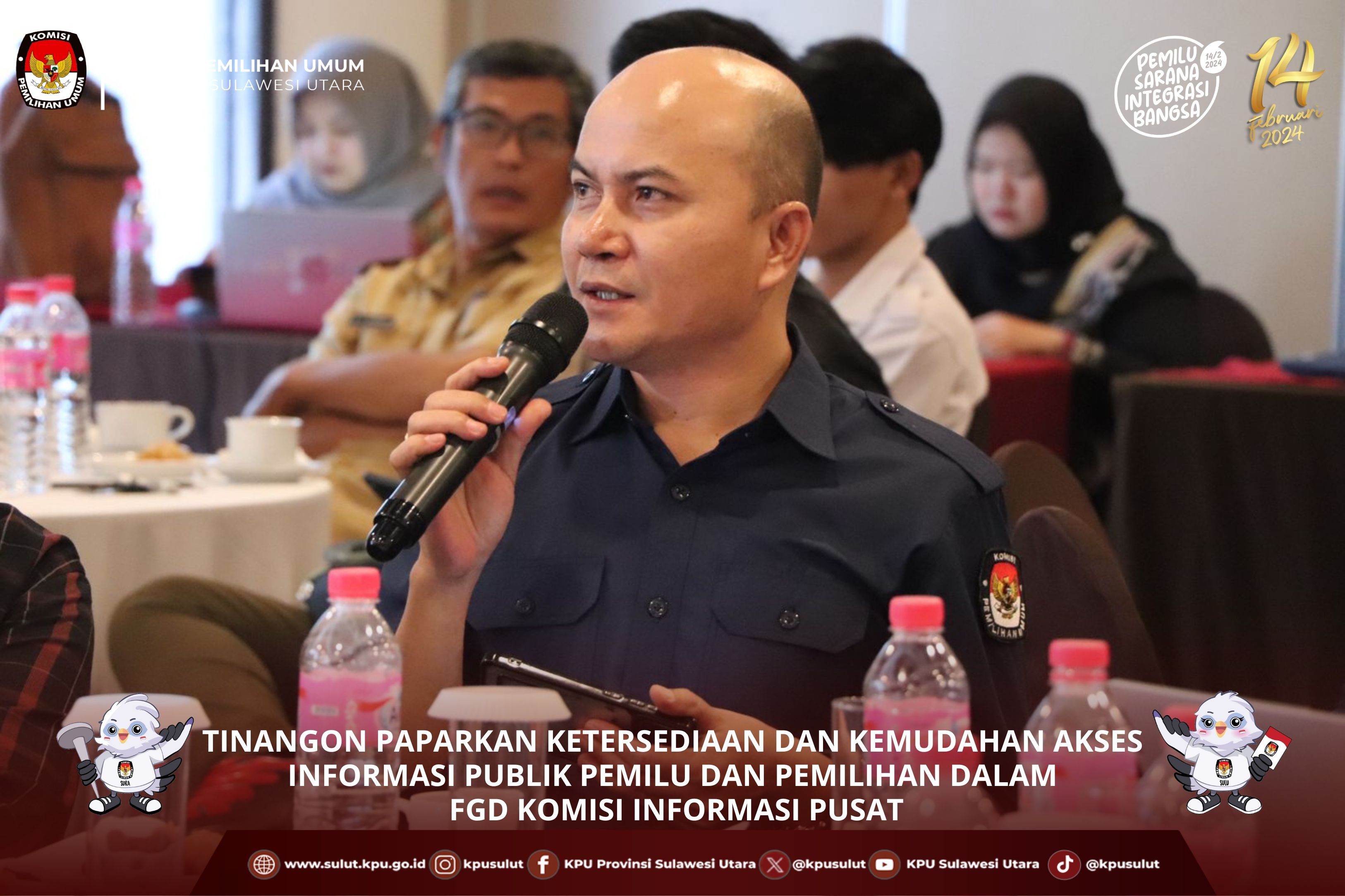 Anggota KPU Sulut, Meidy Tinangon dalam kesempatan memaparkan materi, memberikan gambaran ketersediaan dan kemudahan akses informasi pemilu dan pemilihan di KPU Provinsi Sulawesi Utara. Selain itu, dipaparkan juga beberapa usulan indikator pemantauan pelaksanaan keterbukaan informasi publik.
